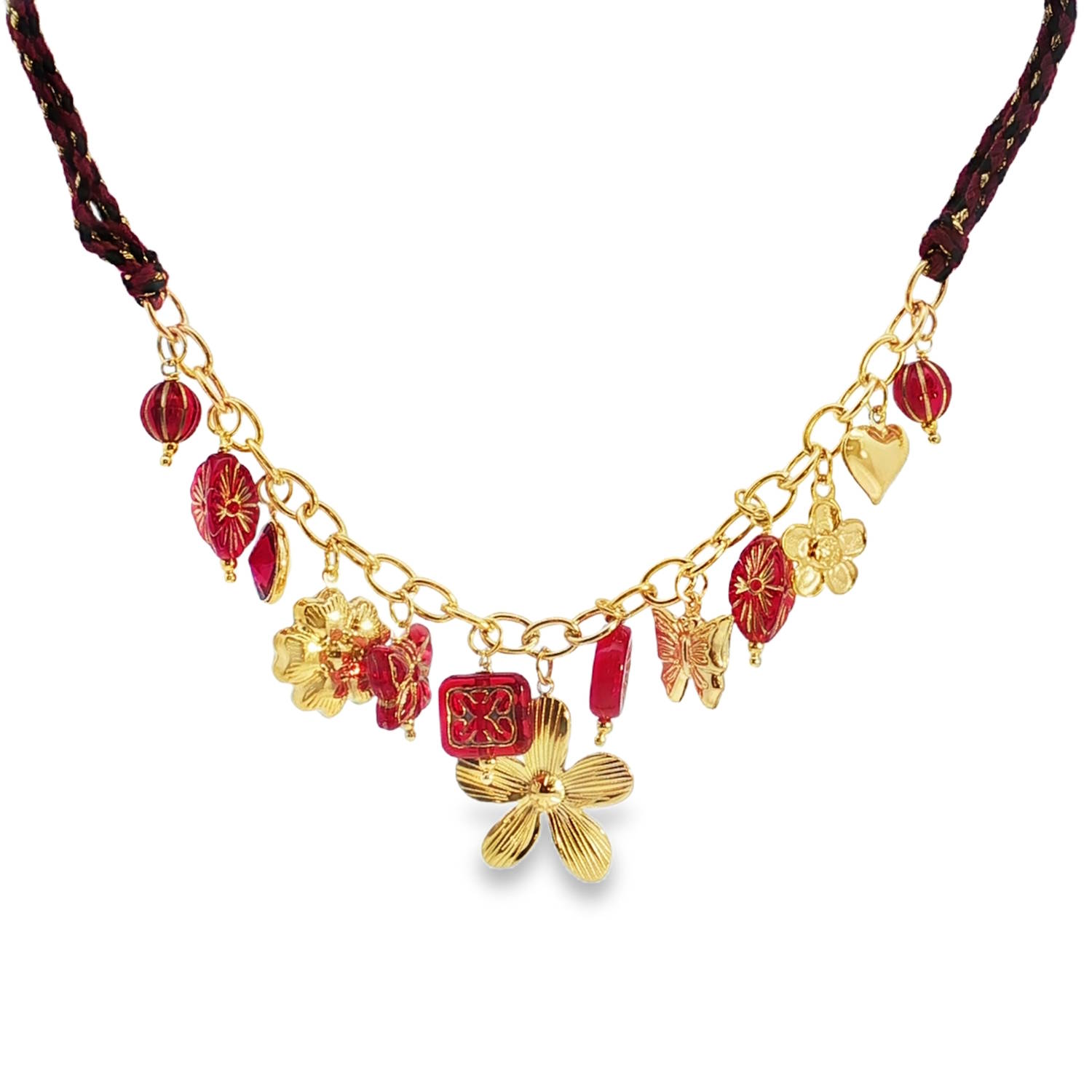Ce collier à breloques en acier doré et avec un cordon multicolore est un accessoire éblouissant.