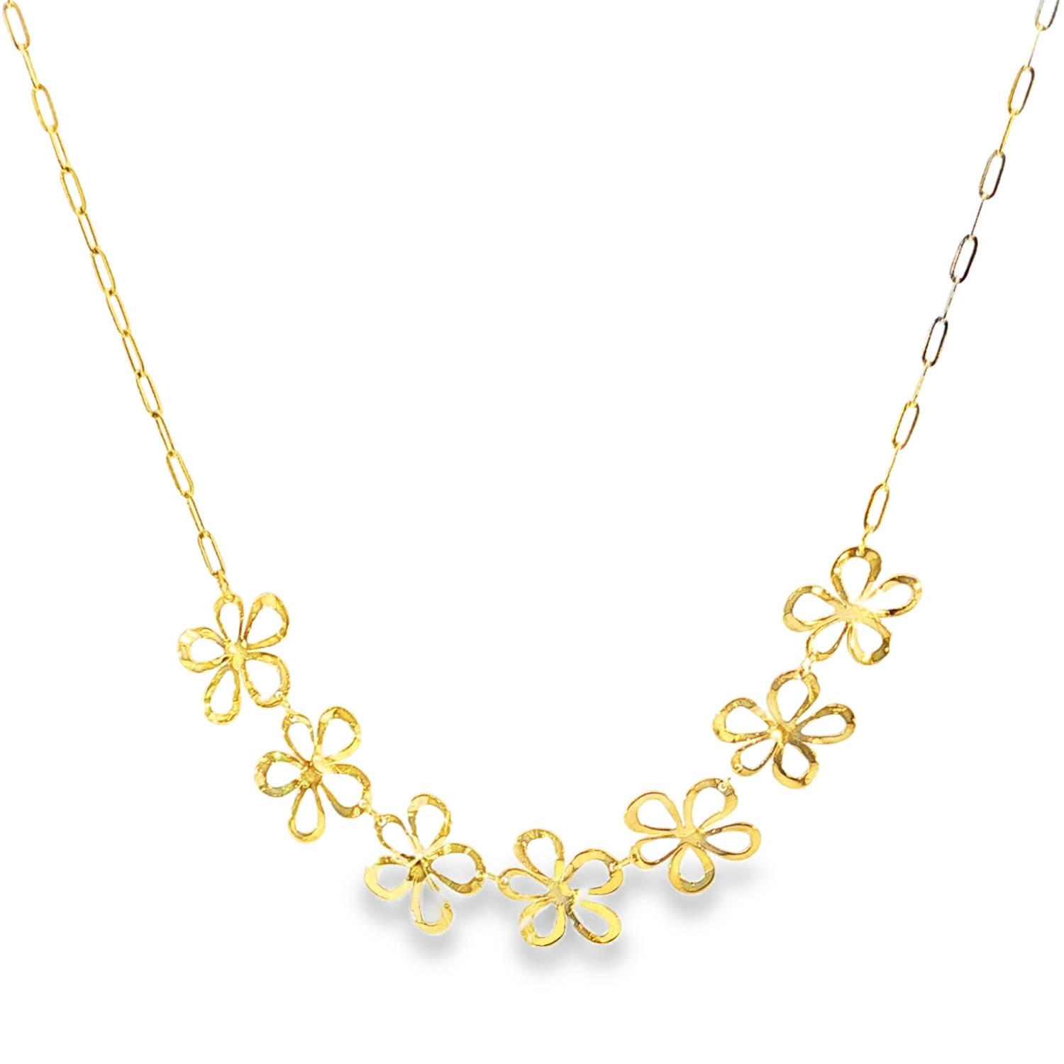 Il arbore une chaîne fine ornée de motifs floraux ajourés, capturant la lumière avec subtilité.