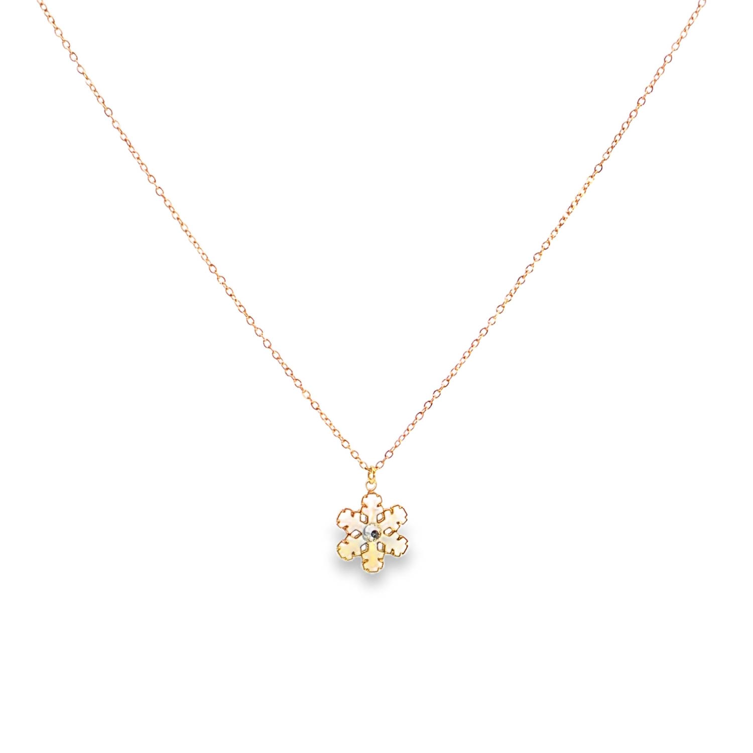 Ce délicat collier en acier doré est orné d'un pendentif charmant en forme de flocon de neige.