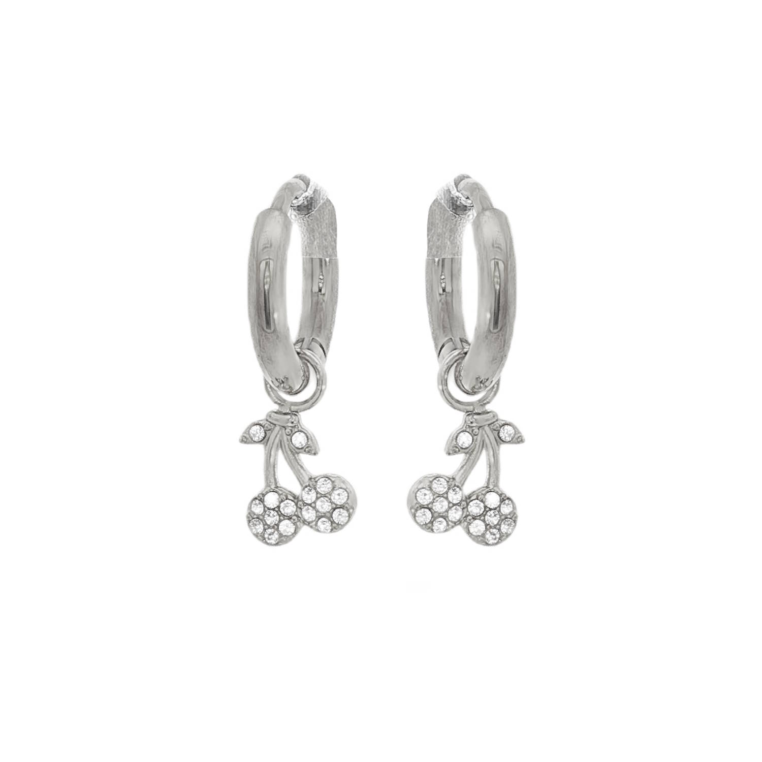 Rehaussez votre style avec ces adorables boucles d'oreilles créoles. Fabriquées en acier argenté éclatant, elles arborent un délicat motif de cerises orné de strass incolores de taille brillant, apportant une touche de fraîcheur et d'élégance ludique à votre allure.