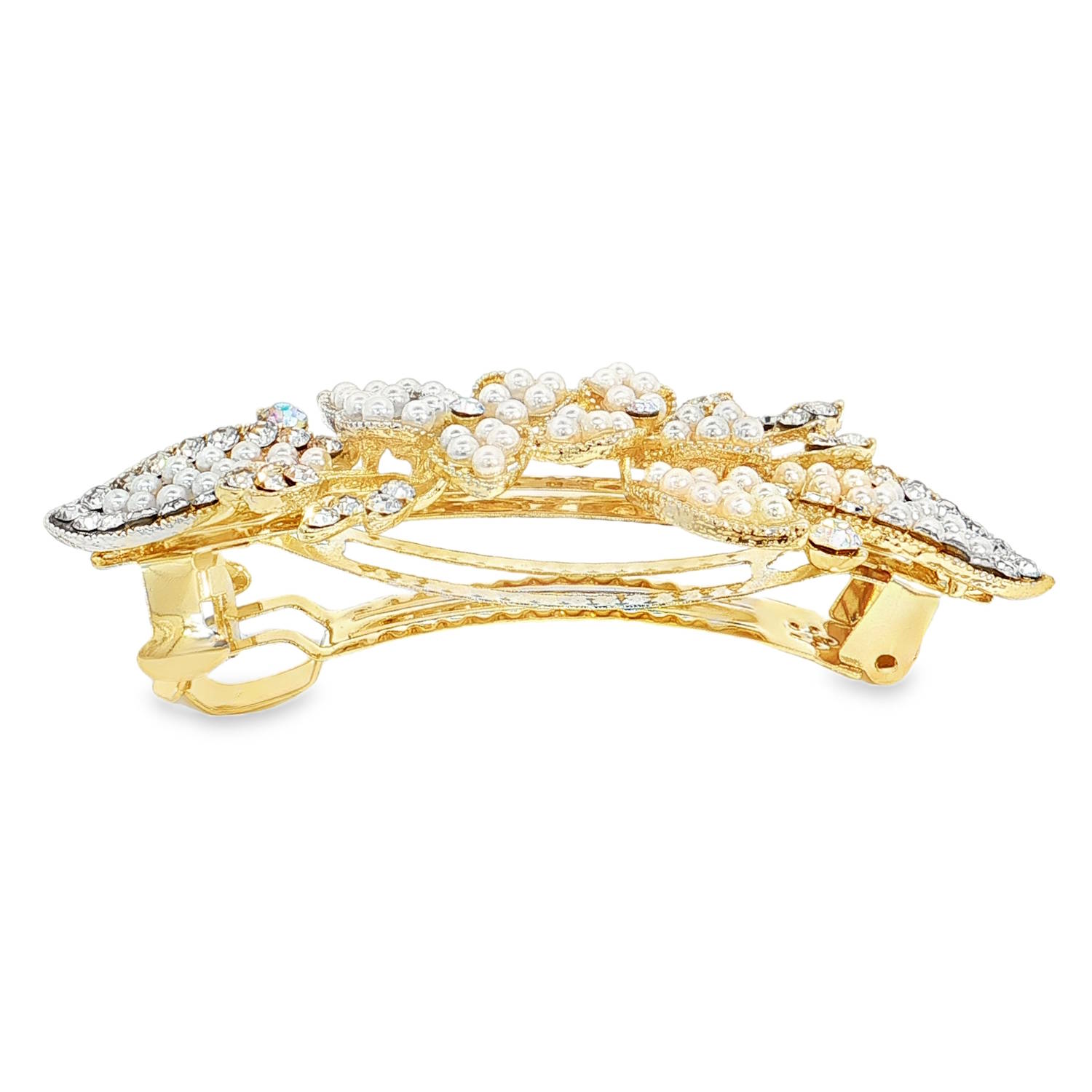 Élégante barrette en métal doré ornée de perles rondes cabochon.