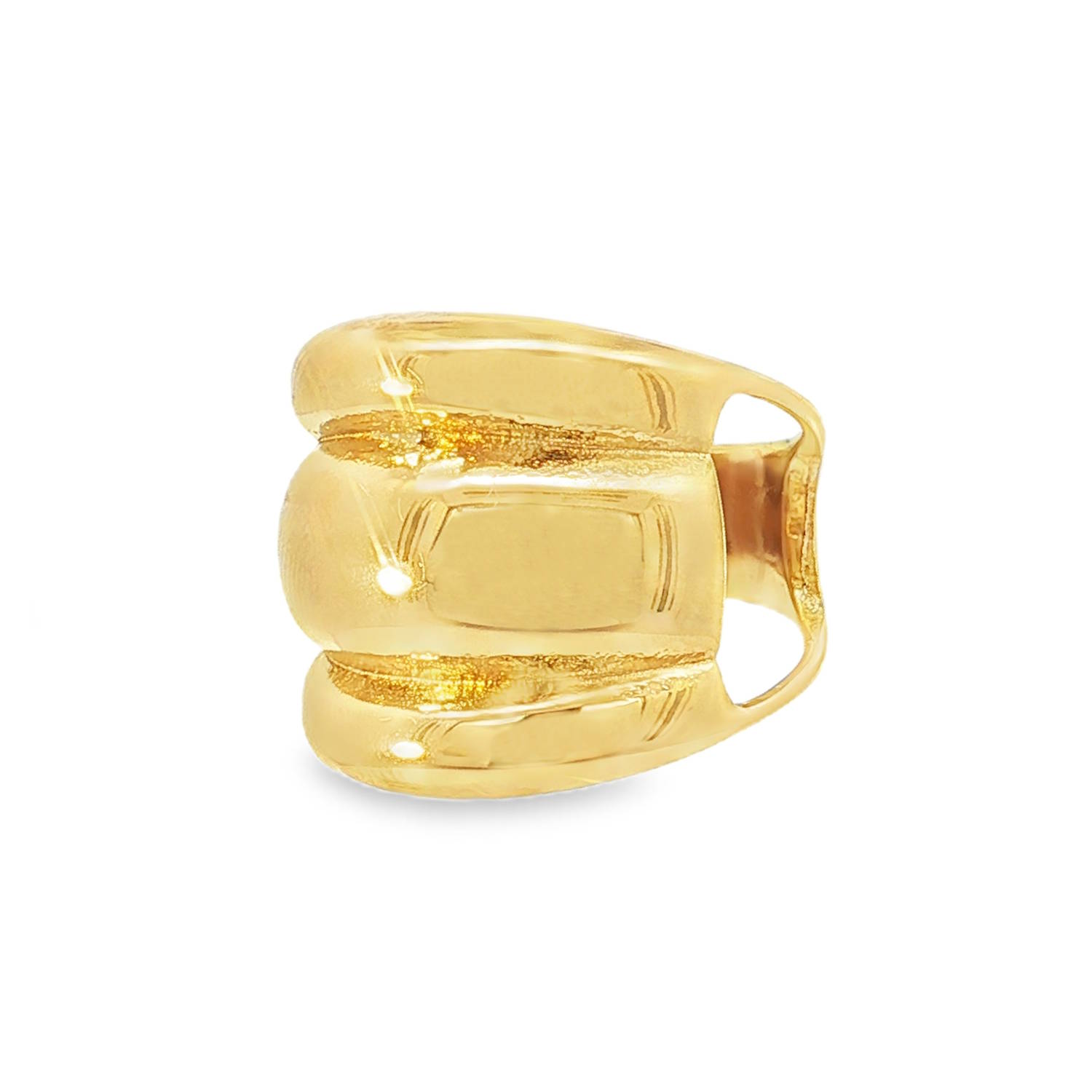 Sa conception sculpturale et ses finitions polies mettent en valeur l'éclat chaleureux du doré, créant un accessoire saisissant pour toute occasion.