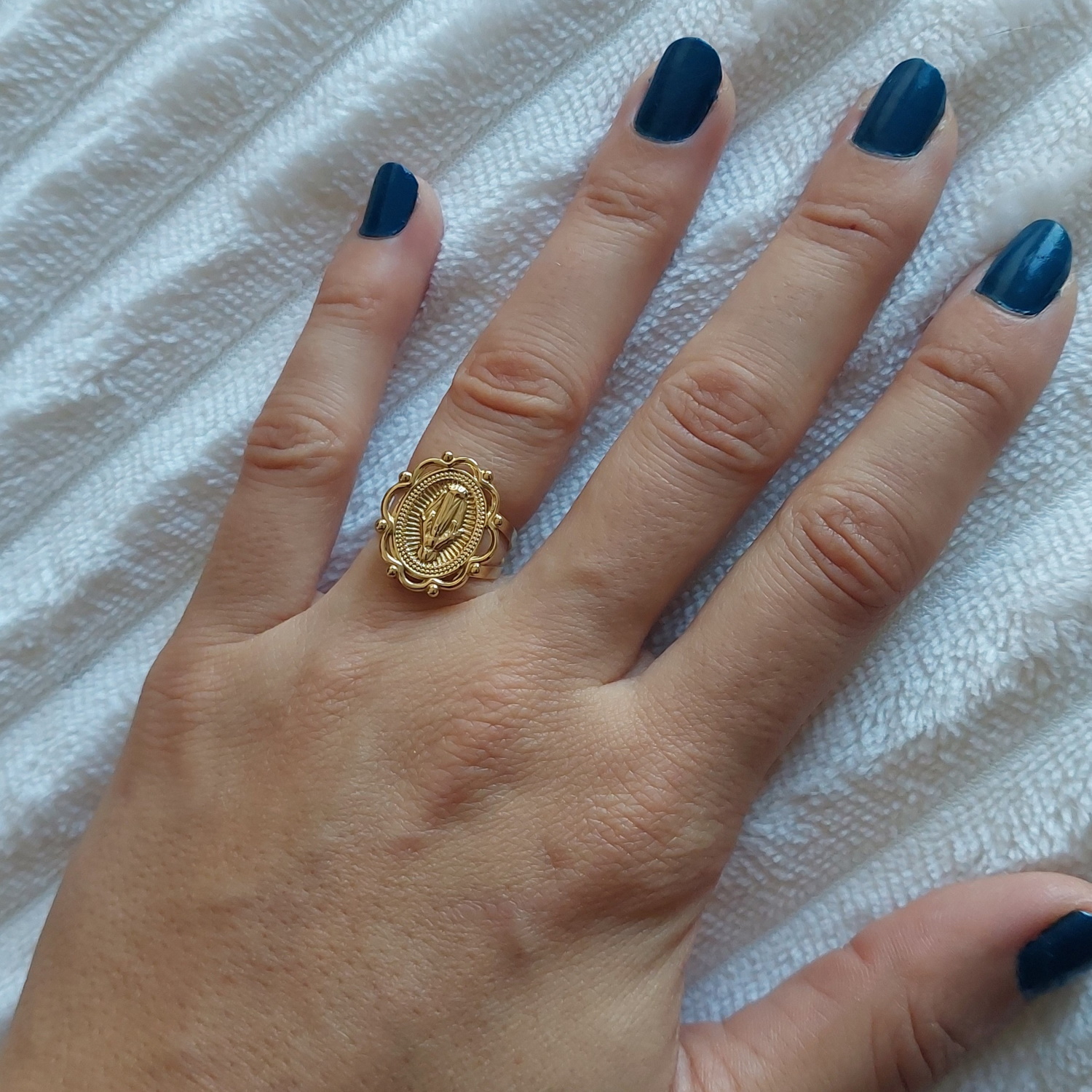 Cette bague en acier doré présente un design religieux délicat.<br/>La pièce maîtresse est une représentation détaillée, entourée d'une bordure ornée.<br/>La finition polie accentue l'éclat du doré, créant un bijou à la fois spirituel et élégant, idéal pour exprimer sa foi avec raffinement.<br/>Une alliance parfaite de tradition et de style.<br/>Taille ajustable. Ovale  Adolescent Adulte Femme Fille Indémodable Religion Symboles Cette bague en acier doré présente un design religieux délicat.<br/>La pièce maîtresse est une représentation détaillée, entourée d'une bordure ornée.<br/>La finition polie accentue l'éclat du doré, créant un bijou à la fois spirituel et élégant, idéal pour exprimer sa foi avec raffinement.<br/>Une alliance parfaite de tradition et de style.<br/>Taille ajustable. Ovale  Adolescent Adulte Femme Fille Indémodable Religion Symboles