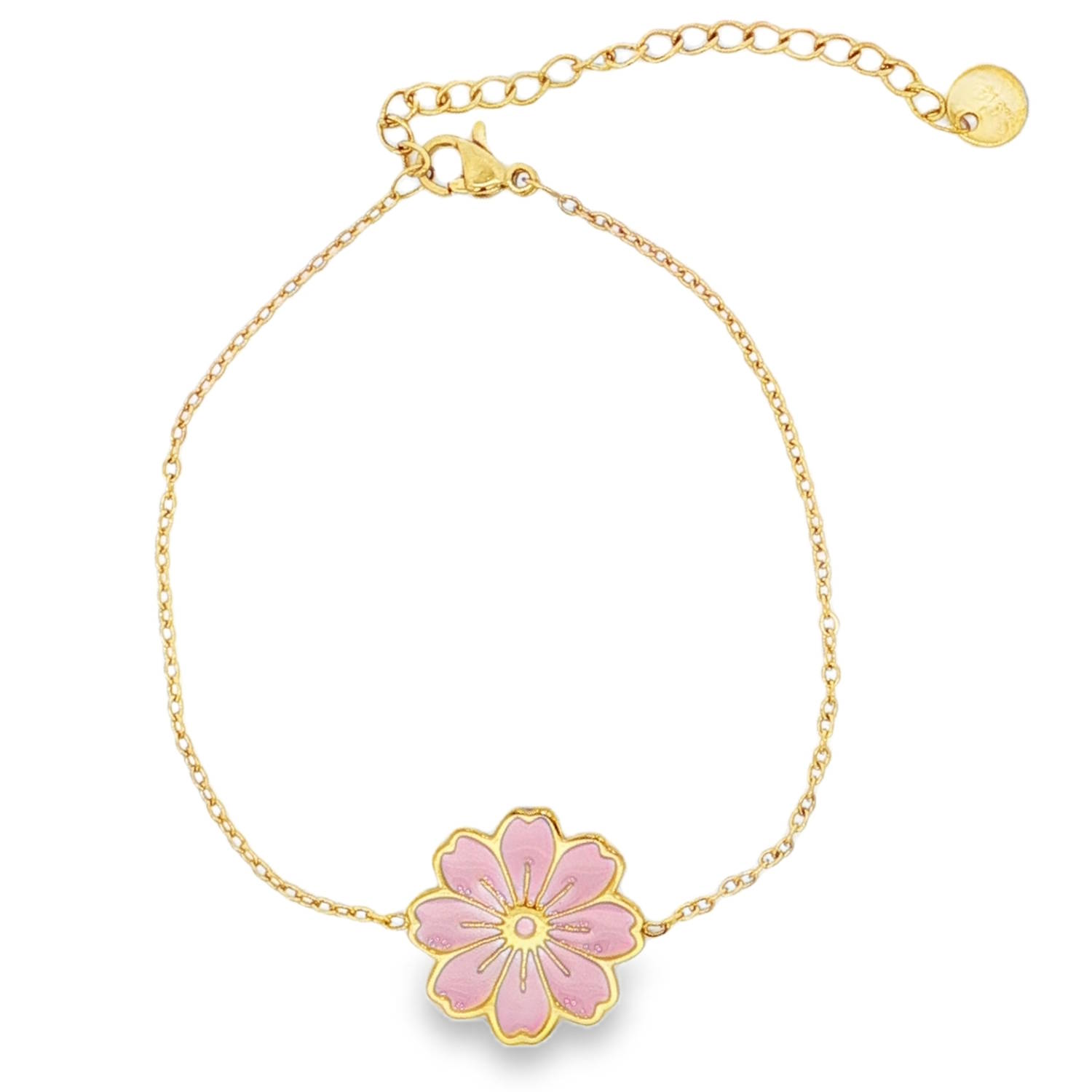 Ce bracelet chaîne en acier doré arbore une fleur pavée d'émail rose.