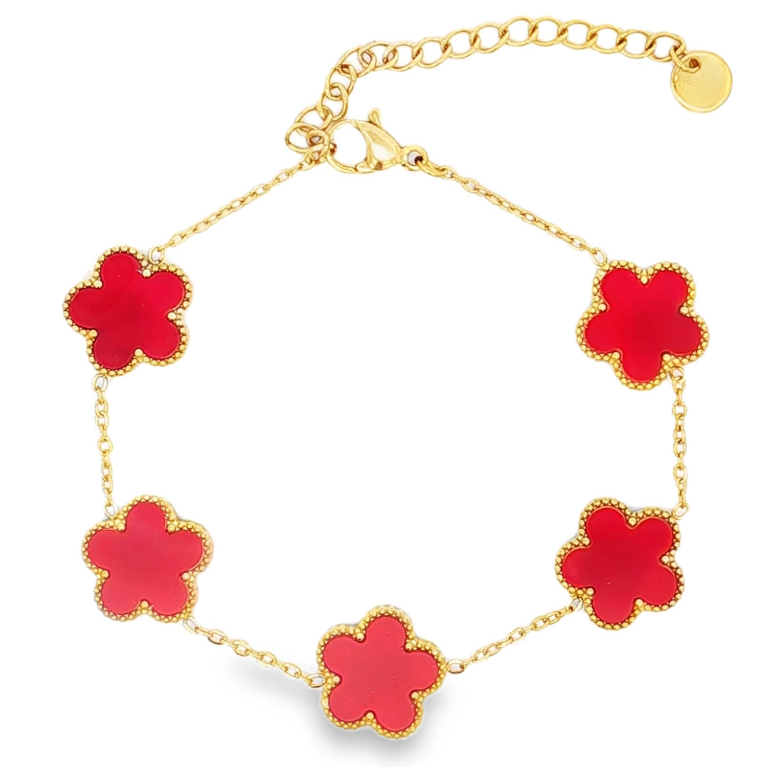Ce délicat bracelet chaîne en acier doré est orné de cinq pierres rouges taillés en cabochon en forme de fleur.