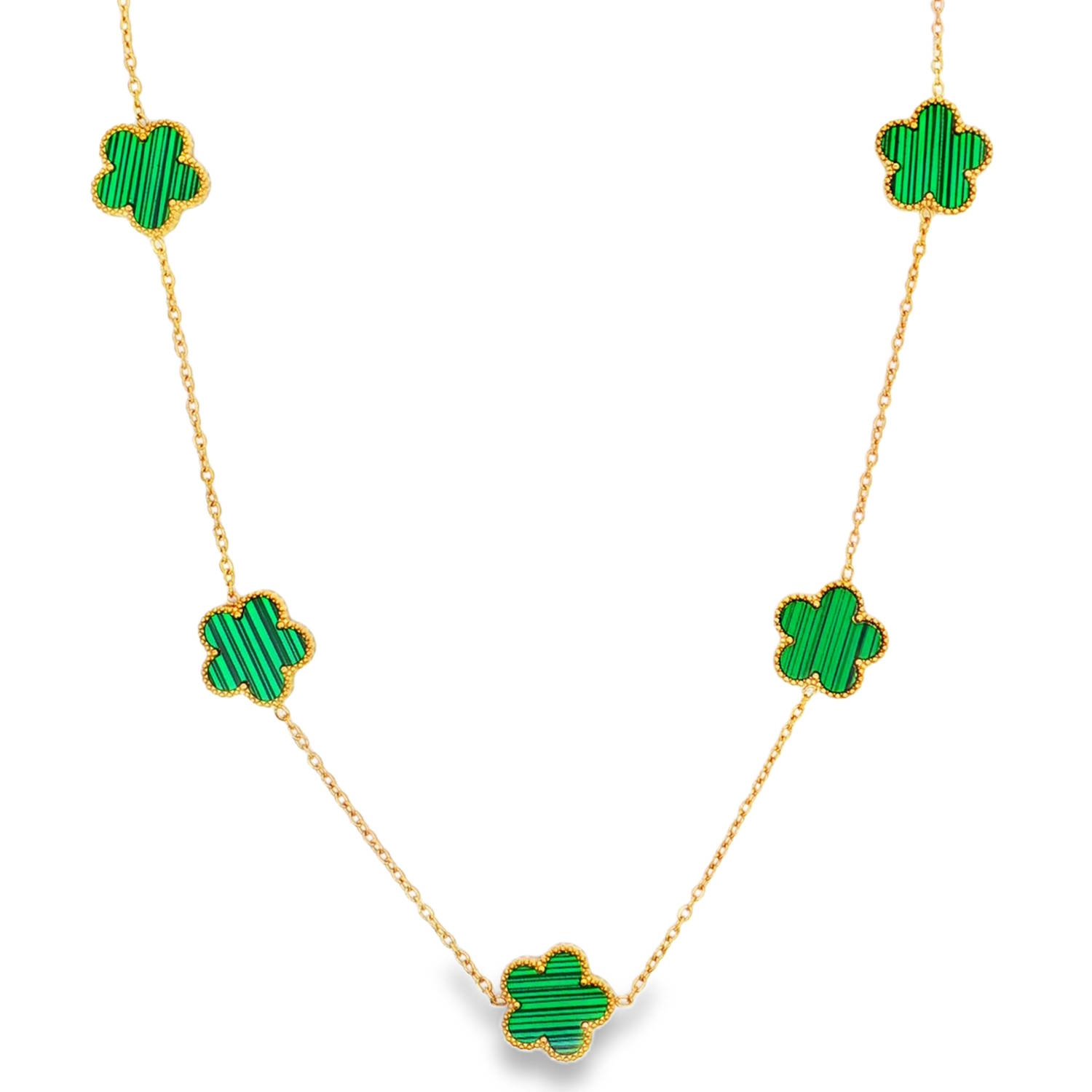 Sublime collier en acier doré, agrémenté de motifs floraux en malachite d'imitation cabochon. Le contraste saisissant entre l'éclat doré et le vert profond de la malachite d'imitation confère à ce bijou une élégance intemporelle.