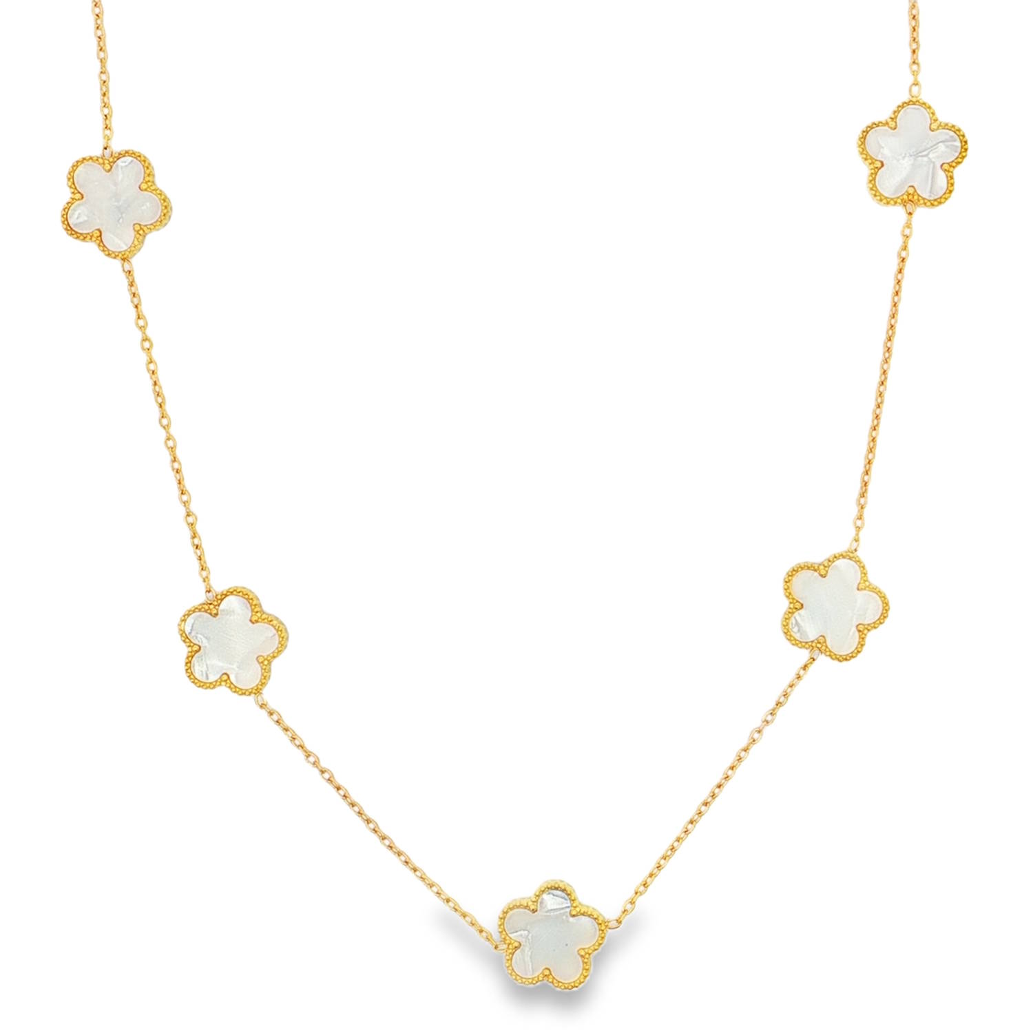 Ce délicat collier chaîne en acier doré est orné de motifs floraux raffinés en nacre d'imitation.