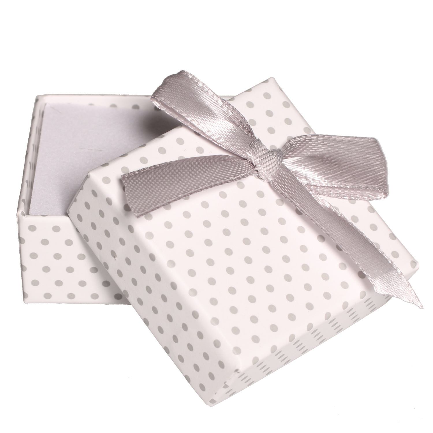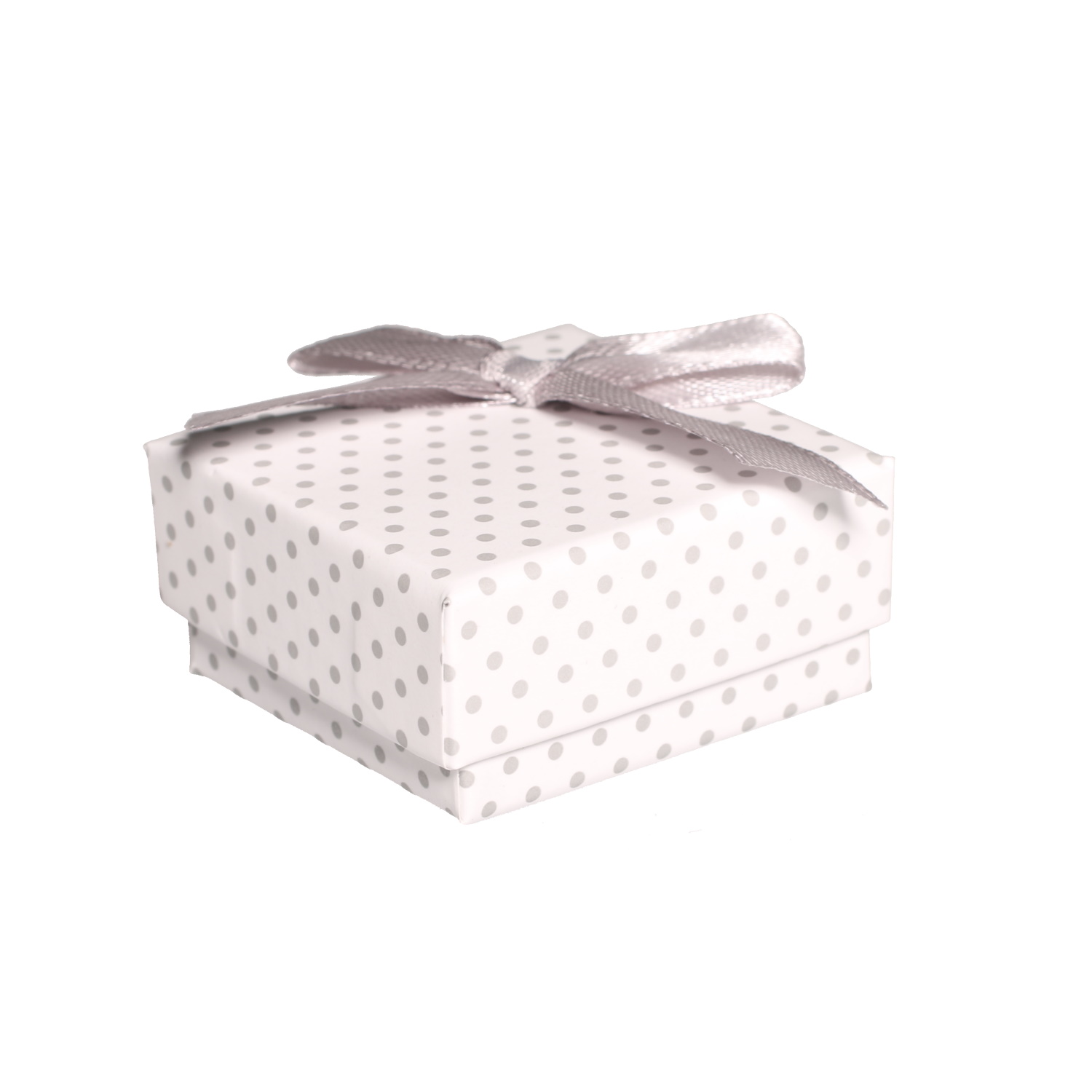 Boîte cadeau écrin pour boucles d'oreilles avec des motifs de pois et avec un nœud papillon.