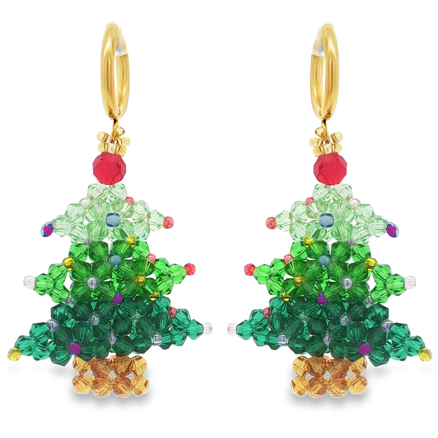Captivantes boucles d'oreilles créoles pendantes en acier doré, arborant un motif festif d'arbre de Noël.