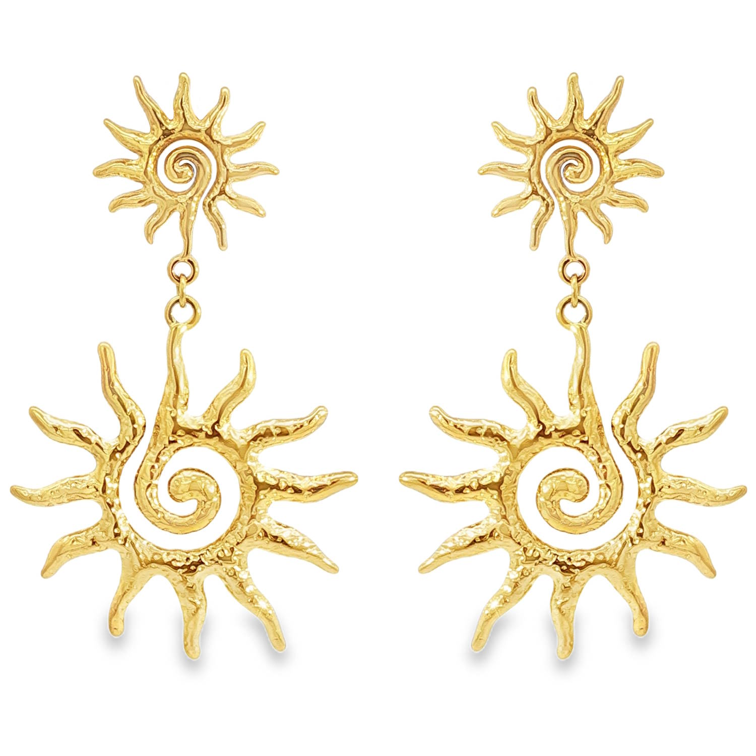 Description Rayonnantes et solaires, ces boucles d'oreilles pendantes en acier doré captivent par leur design original. L'ornement en forme de soleil, reproduit avec une spirale hypnotique, est une ode à la lumière et à l'énergie. Un bijou unique qui illumine le visage et apporte une touche d'éclat à votre style. Largeur 35 mm Hauteur 55 mm Matière(s) Acier . L'acier utilisé dans la bijouterie existe sous plusieurs qualités. Nous utilisons principalement la qualité 316L, qualité qui est utilisée en chirurgie. Cet acier est donc inoxydable et reste très résistant. Fermoir Tiges poussettes Couleur(s) dominante(s) Doré Public Adolescent , Adulte . Genre Femme , Fille . Saison Indémodable . Thème(s) Nature . Cliquez sur une matière, un thème, une couleur ou une collection pour voir tous les articles associés.