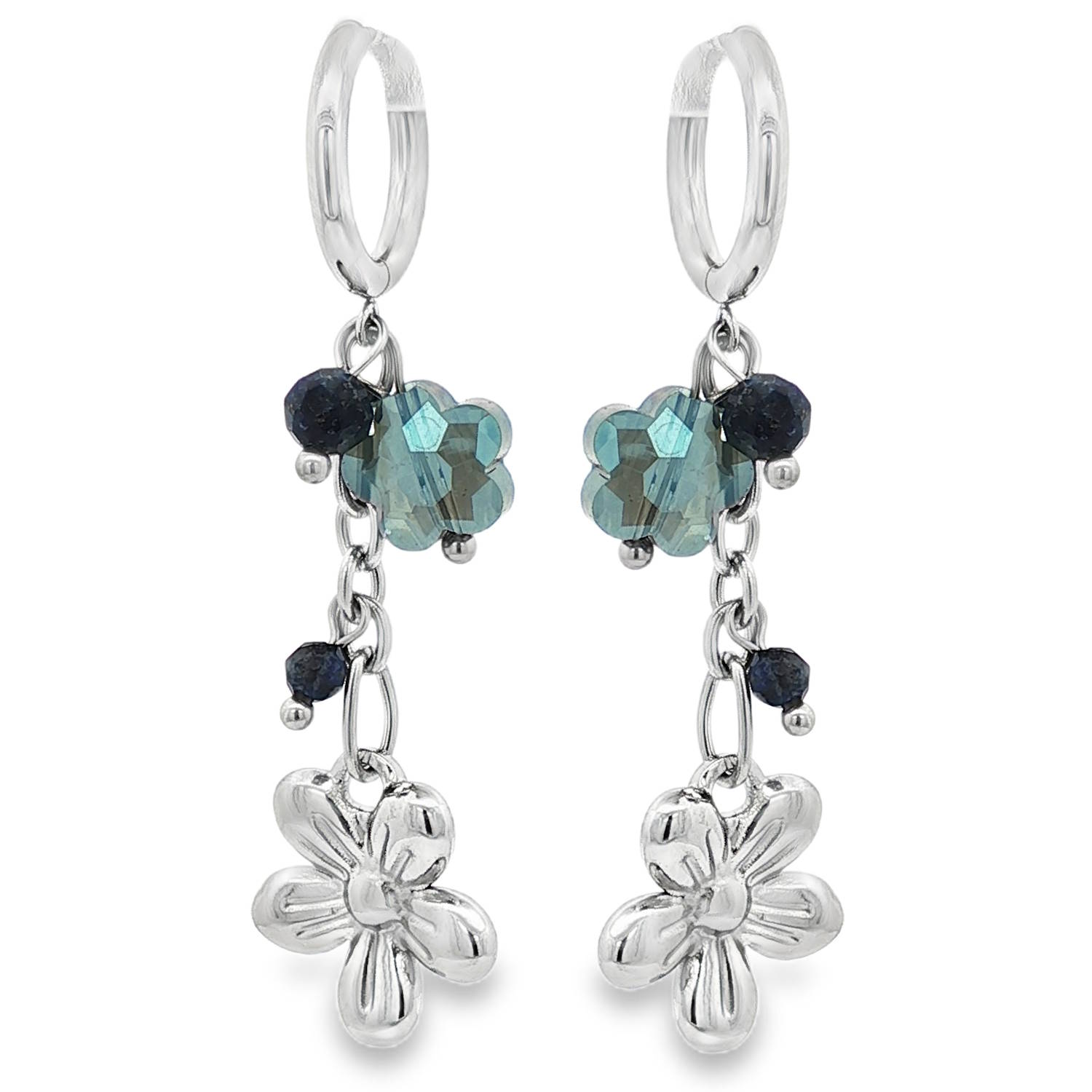 Sublimes boucles d'oreilles créoles pendantes en acier argenté, ornées de cristaux taillés en cabochon, d'un bleu fascinant.