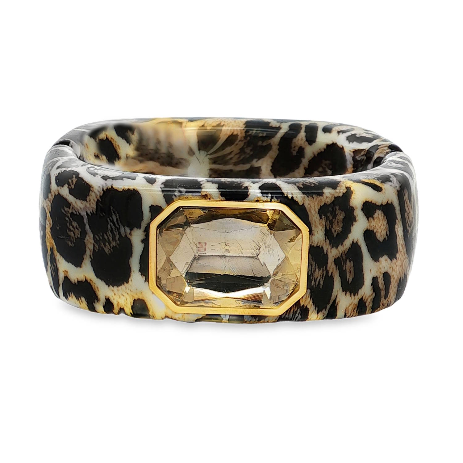 Sa texture à motif léopard est rehaussée par un cristal de taille émeraude, aux facettes mixtes, capturant la lumière avec élégance.