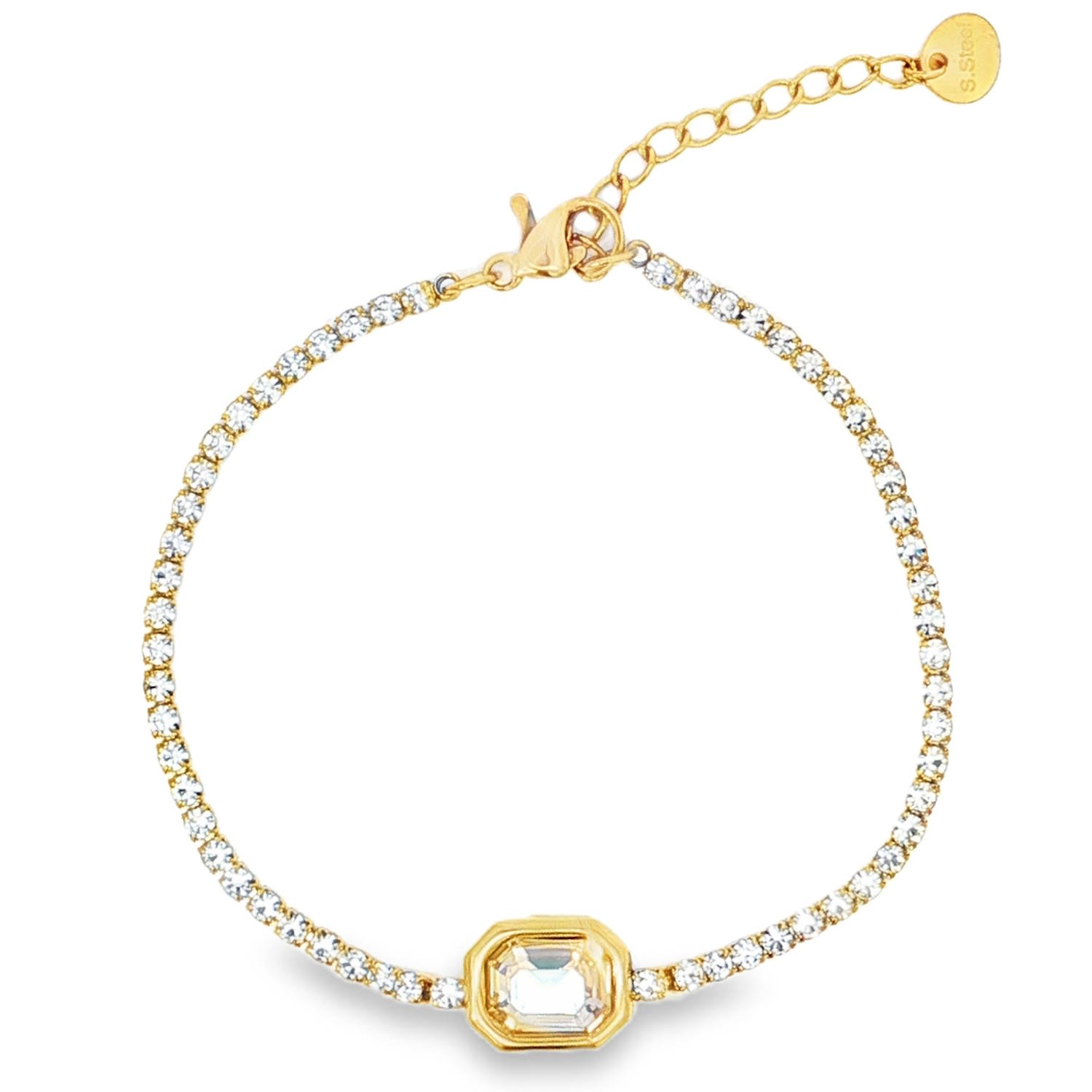 Ce délicat bracelet tennis en acier doré est orné d'une rangée de cristaux brillants à taille brillant et sublimé par un péridot de taille émeraude à degrés, d'un doré éclatant.