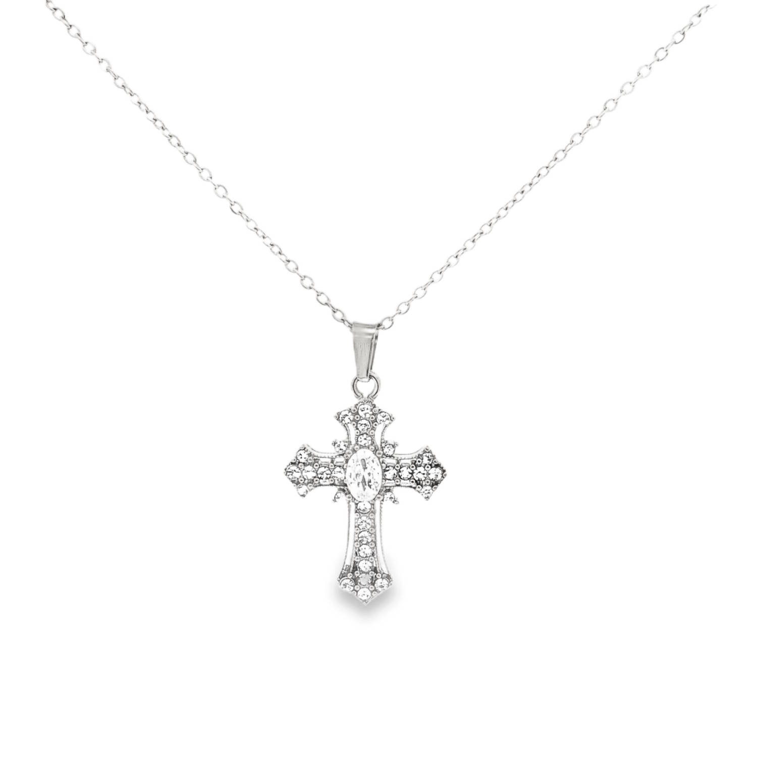Ce collier à pendentif en forme de croix, façonné en acier argenté, présente un design raffiné avec un cristal incolore de taille ovale brillant.