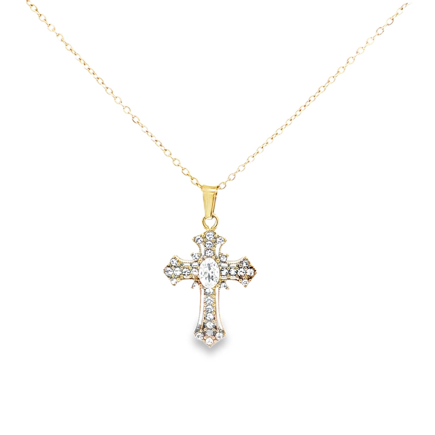 Ce collier à pendentif en forme de croix, façonné en acier doré, présente un design raffiné avec un cristal incolore de taille ovale brillant.