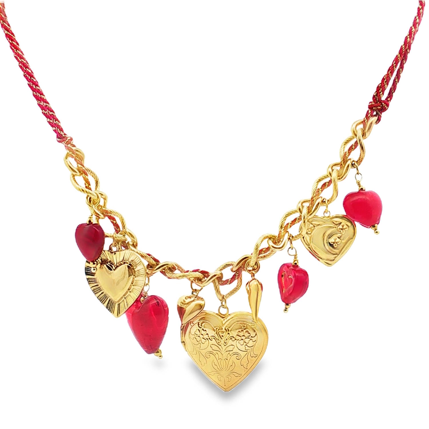 Découvrez ce collier à breloques en acier doré, une pièce audacieuse ornée de détails gravés et de touches de rouge passion.