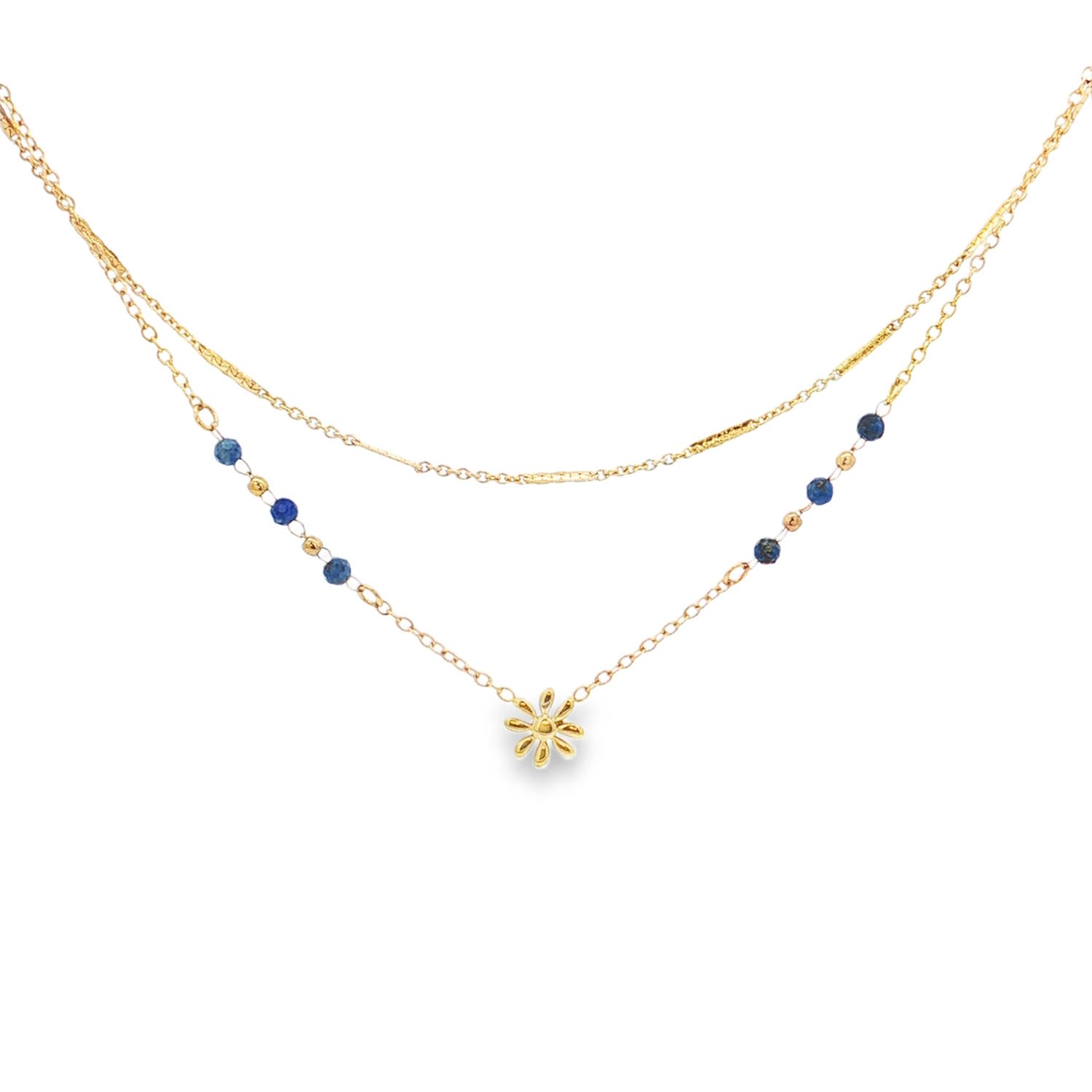 Sublime collier double rangs en acier doré, mettant en valeur la profondeur céleste des perles bleues.