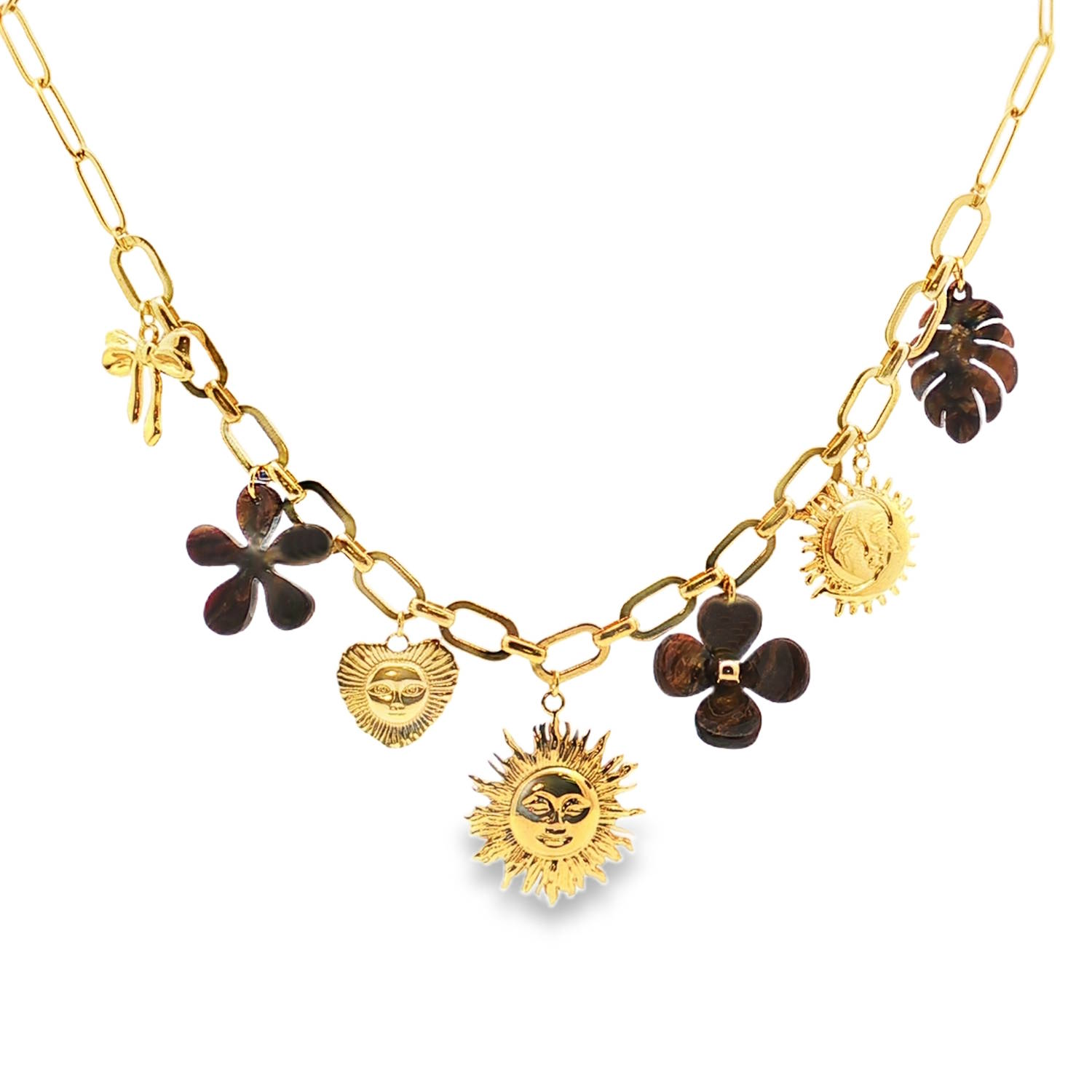 Sublime collier à breloques en acier doré, une ode à la lumière et à la nature.