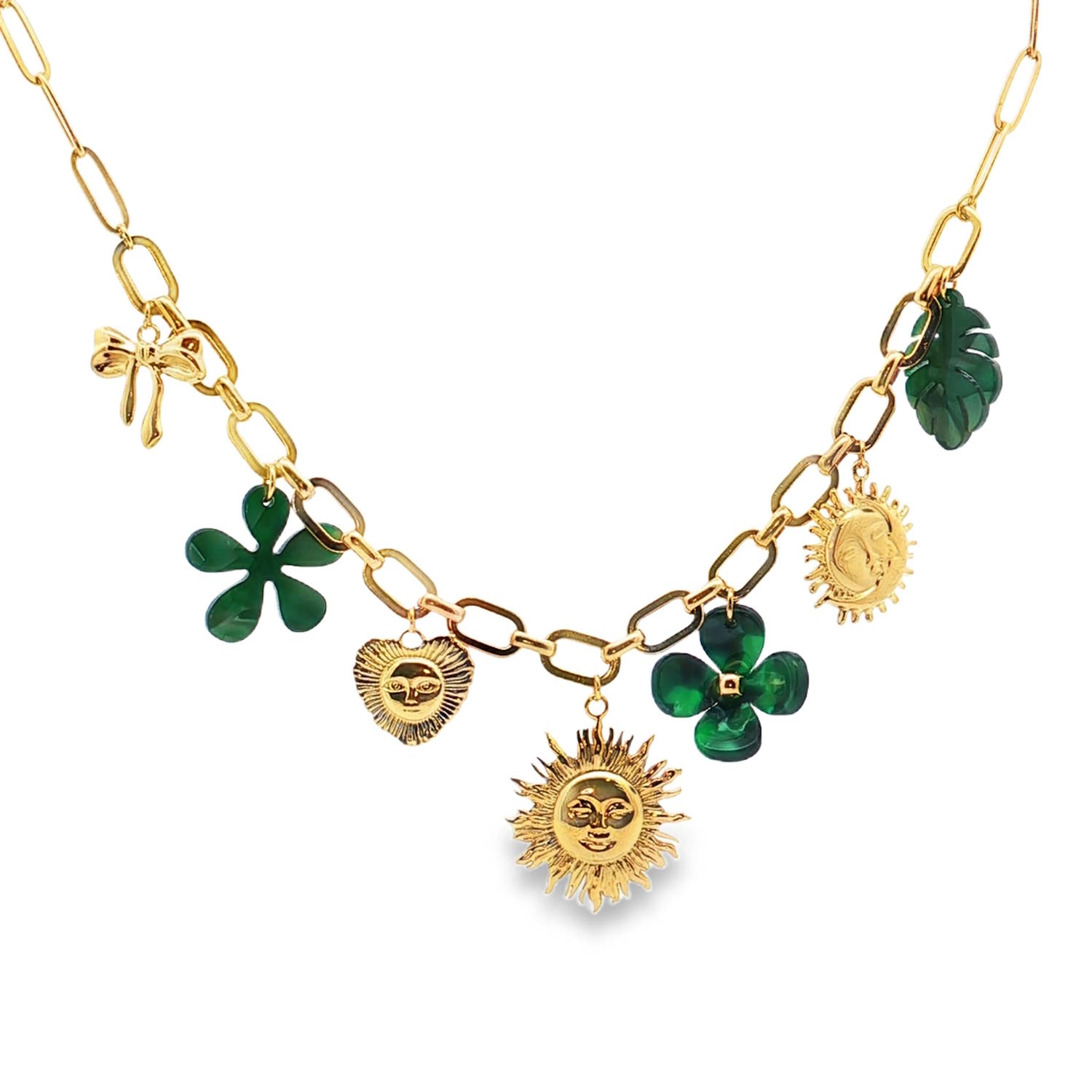Sublime collier à breloques en acier doré, une ode à la lumière et à la nature.