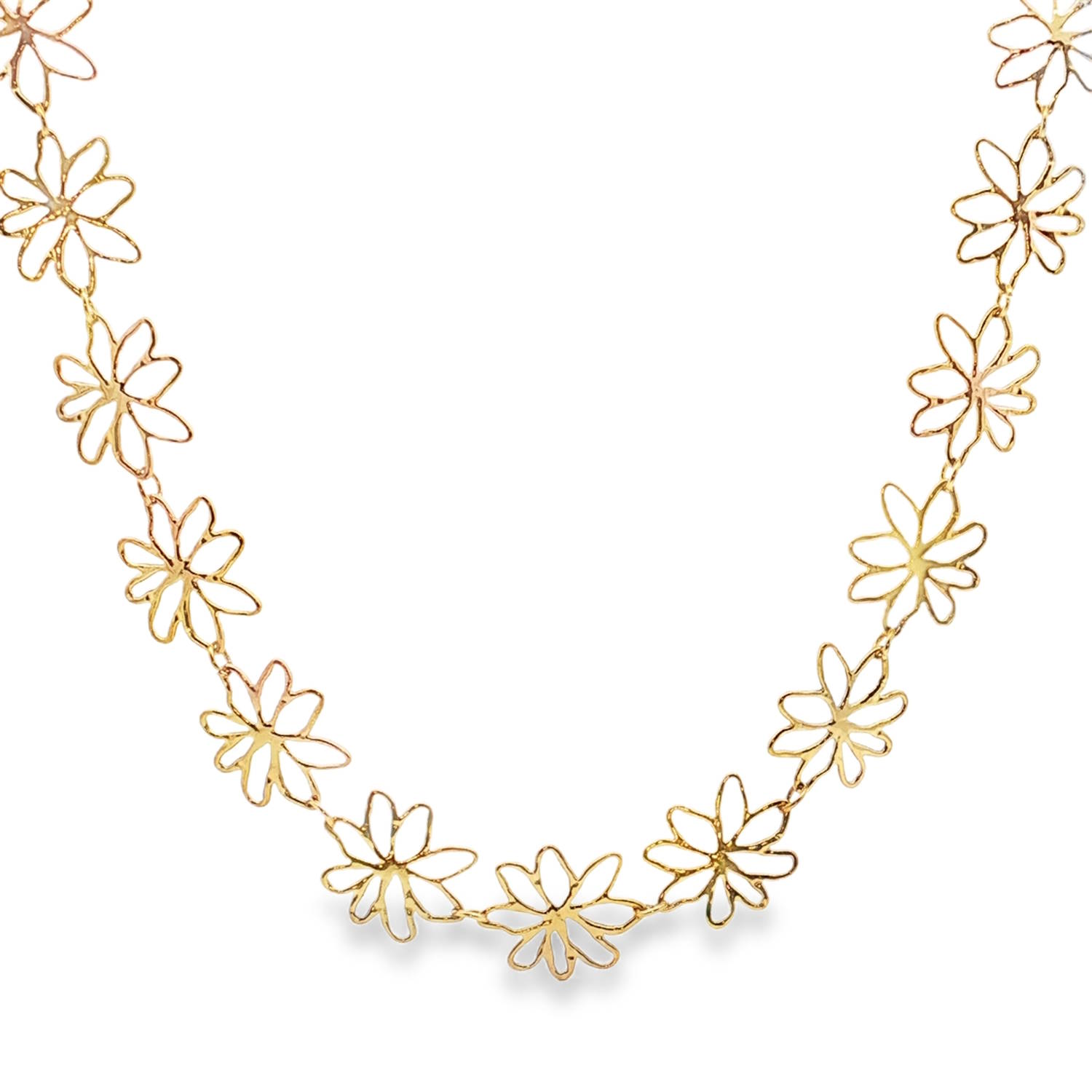 Description Cette délicate chaîne en acier doré, ornée de motifs floraux ajourés, apporte une touche de fraîcheur et de féminité à toute tenue. Son design épuré et son éclat subtil en font un accessoire parfait pour un style élégant au quotidien. Un bijou raffiné qui célèbre la beauté de la nature avec une sophistication discrète. Fermoir mousqueton avec 5 cm de rallonge. Longueur 42+5 cm [Guide des tailles] Largeur 17 mm Matière(s) Acier . L'acier utilisé dans la bijouterie existe sous plusieurs qualités. Nous utilisons principalement la qualité 316L, qualité qui est utilisée en chirurgie. Cet acier est donc inoxydable et reste très résistant. Fermoir Mousqueton Couleur(s) dominante(s) Doré Public Adolescent , Adulte . Genre Femme , Fille . Saison Indémodable . Thème(s) Fleurs , Nature . Cliquez sur une matière, un thème, une couleur ou une collection pour voir tous les articles associés.