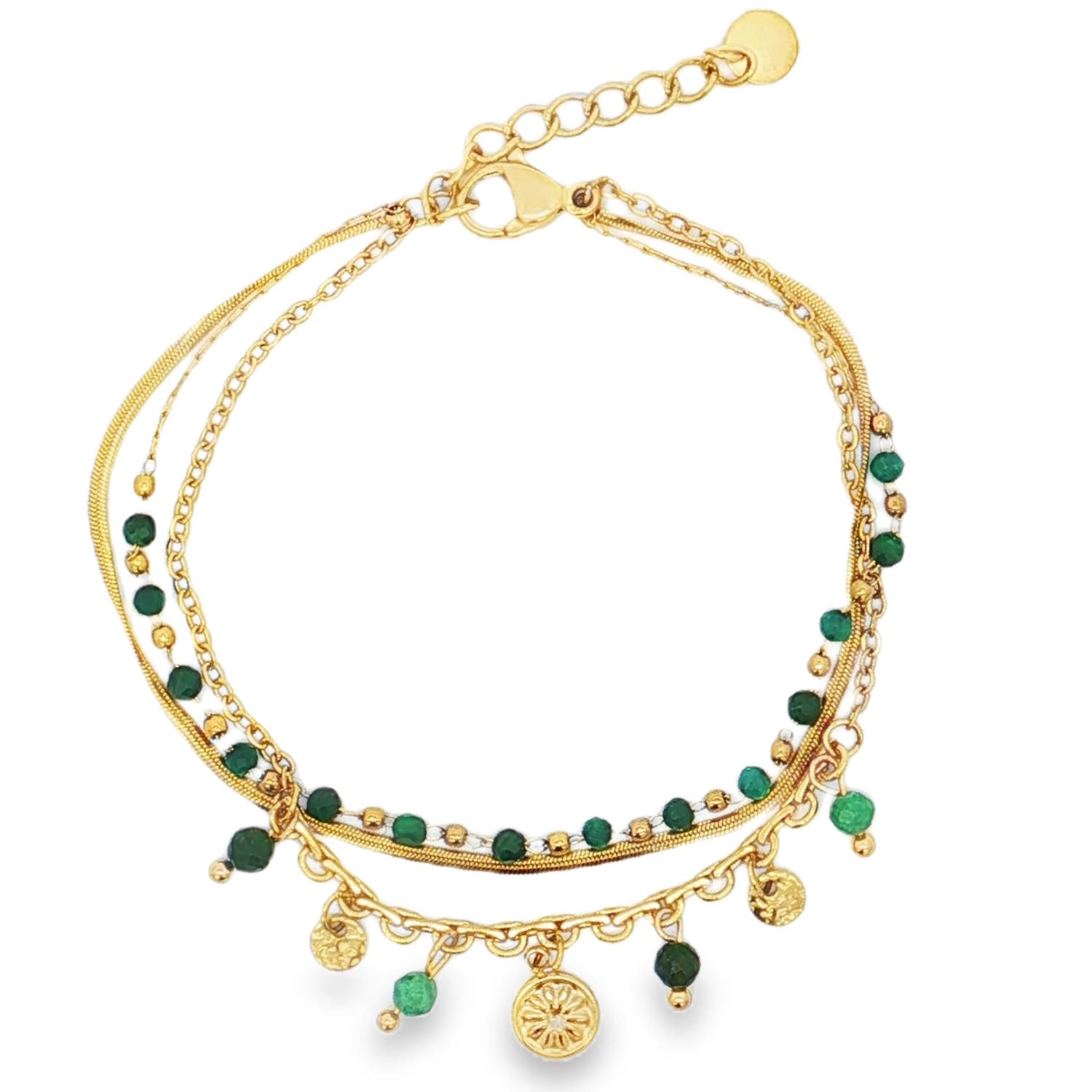 Ce bracelet chaîne en acier doré est orné de perles rondes en pierre verte opaque et vibrante.