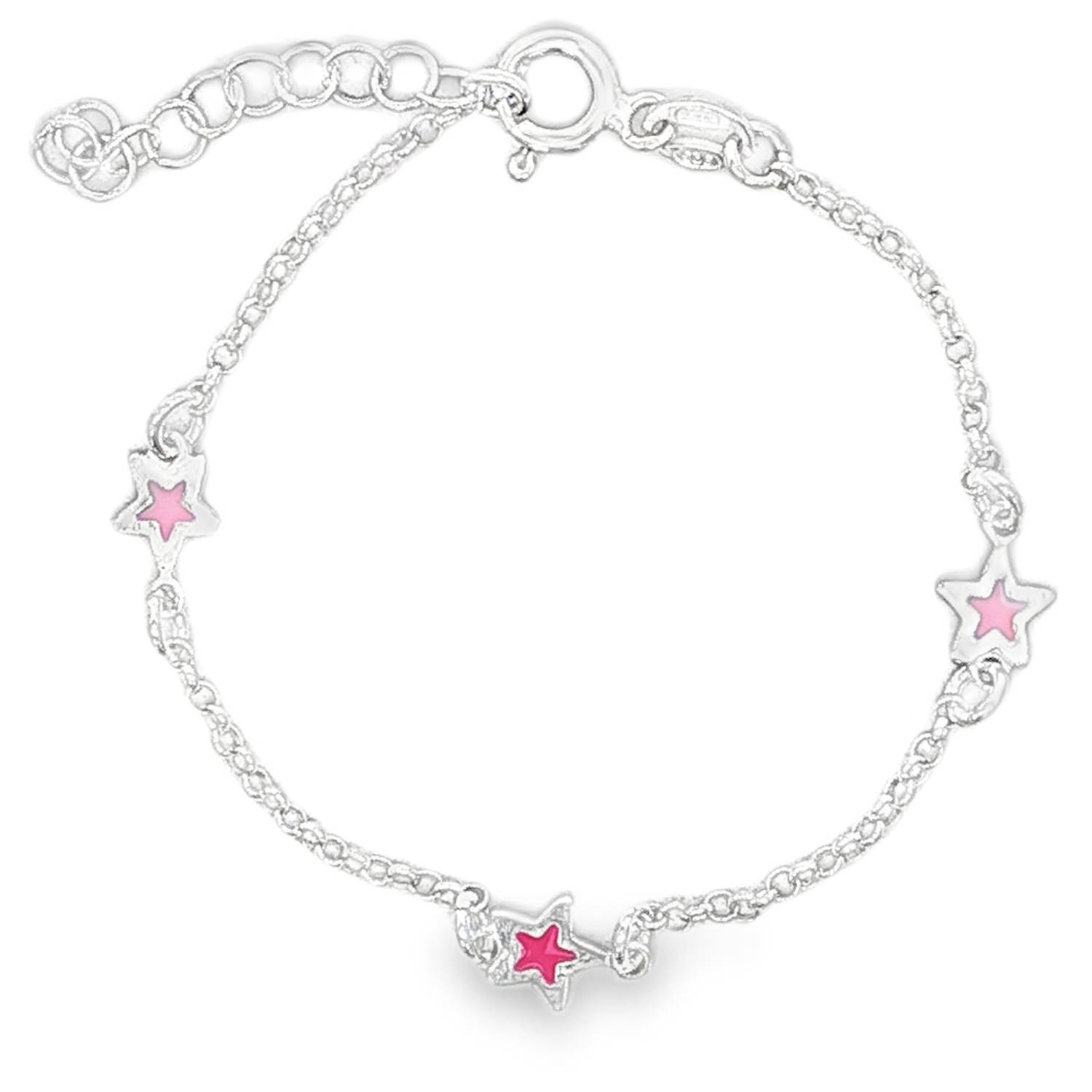 Ce bracelet chaîne en argent 925/000 délicat est rehaussé de motifs d'étoiles émaillées rose.<br/>Son design raffiné en fait un bijou idéal pour ajouter une touche de fantaisie à votre quotidien.<br/>Léger et confortable, ce bracelet est parfait pour être porté seul ou accompagné d'autres bracelets.<br/>Fermoir anneau ressort avec 3 cm de rallonge. Etoile  Adolescent Enfant Femme Fille Indémodable Nature