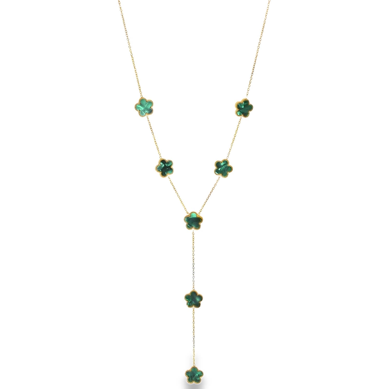 Description Ce collier délicat en acier doré est orné de pierres vertes taille cabochon en forme de fleur. La chaîne fine met en valeur l'éclat naturel des pierres. Un bijou élégant qui ajoutera une touche de couleur et de sophistication à toute tenue, parfait pour un usage quotidien ou pour compléter une allure plus habillée. Cliquez sur une matière, un thème, une couleur ou une collection pour voir tous les articles associés.