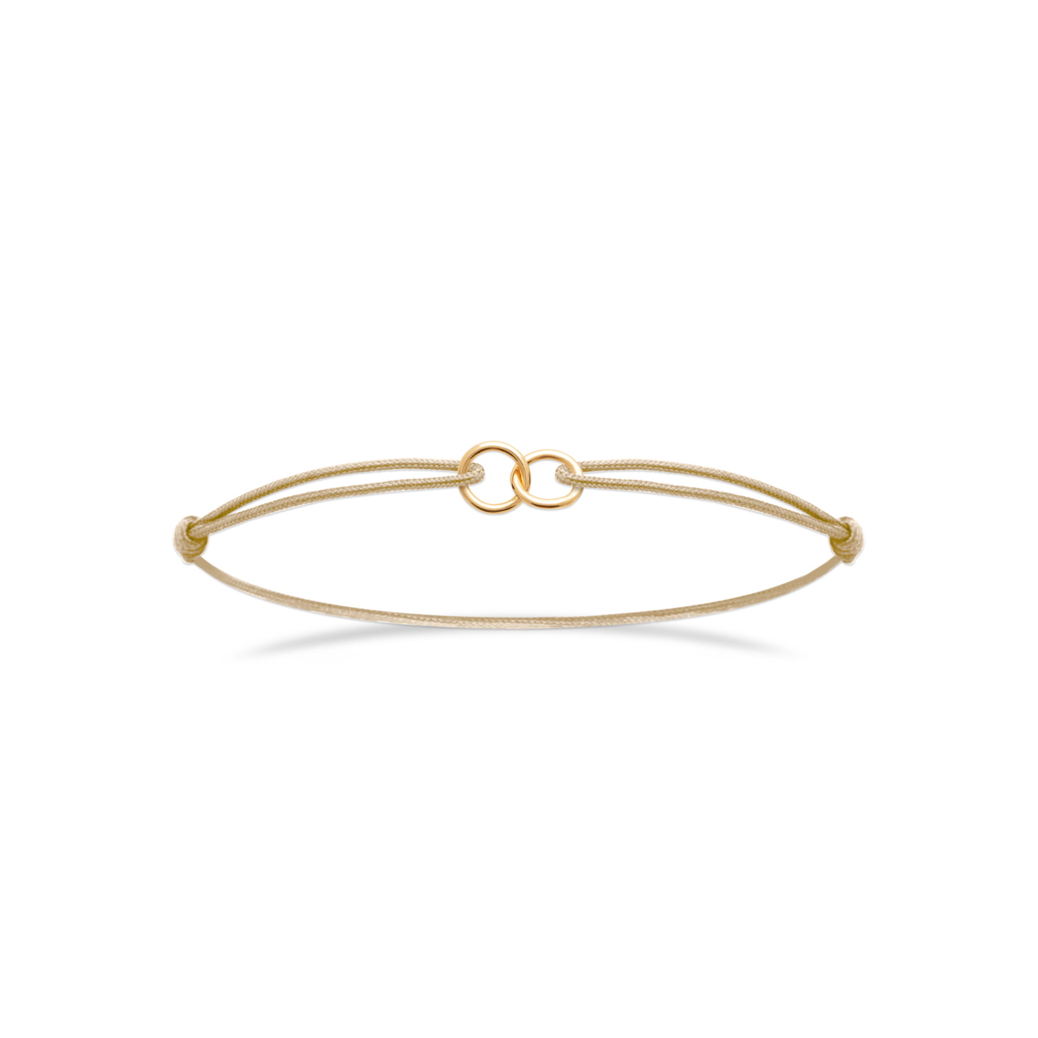 Bracelet composé d'un cordon marron et de deux anneaux entrelacés en plaqué or jaune 18 carats.