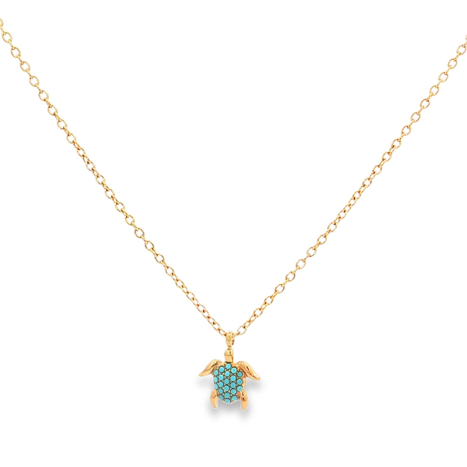 Ce délicat collier en acier doré est orné d'un pendentif tortue, dont la carapace est pavée de turquoises bleu-vert taillées en cabochon.