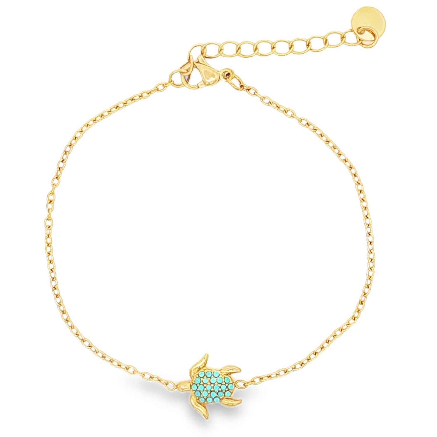 Description Laissez-vous séduire par ce délicat bracelet chaîne en acier doré, orné d'une ravissante tortue sertie de turquoise d'imitation. La turquoise, taillée en cabochon avec des perles rondes, apporte une touche d'élégance naturelle. Un bijou raffiné qui évoque les splendeurs de l'océan. Fermoir mousqueton avec 3 cm. Cliquez sur une matière, un thème, une couleur ou une collection pour voir tous les articles associés.