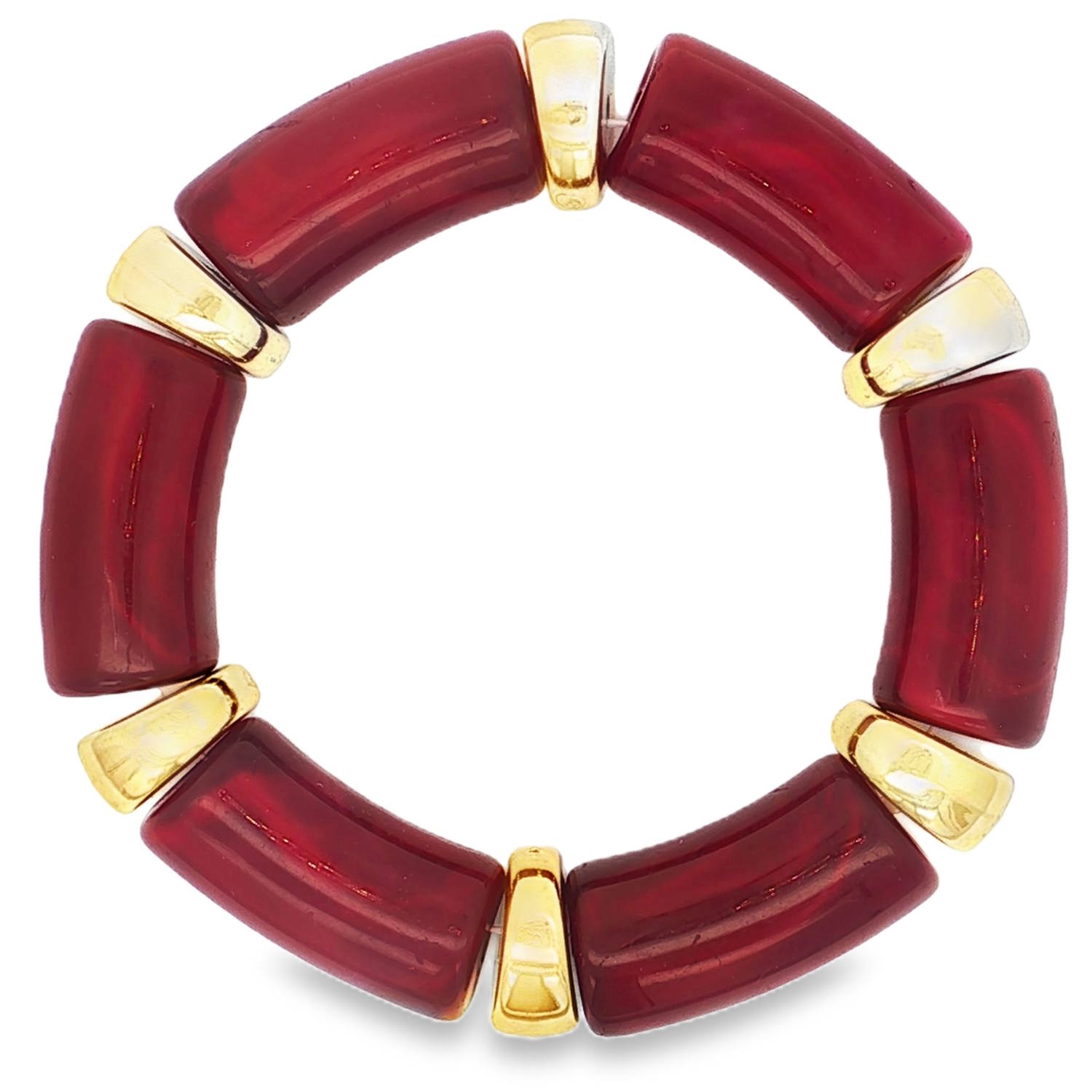 Description Ce bracelet à perles, composé de pièces non métalliques rouge profond, est accentué par des éléments dorés. Le design distinctif, combinant des matériaux riches et des finitions dorées, crée un accessoire frappant et élégant. Un ajout sophistiqué à toute collection de bijoux. Cliquez sur une matière, un thème, une couleur ou une collection pour voir tous les articles associés.