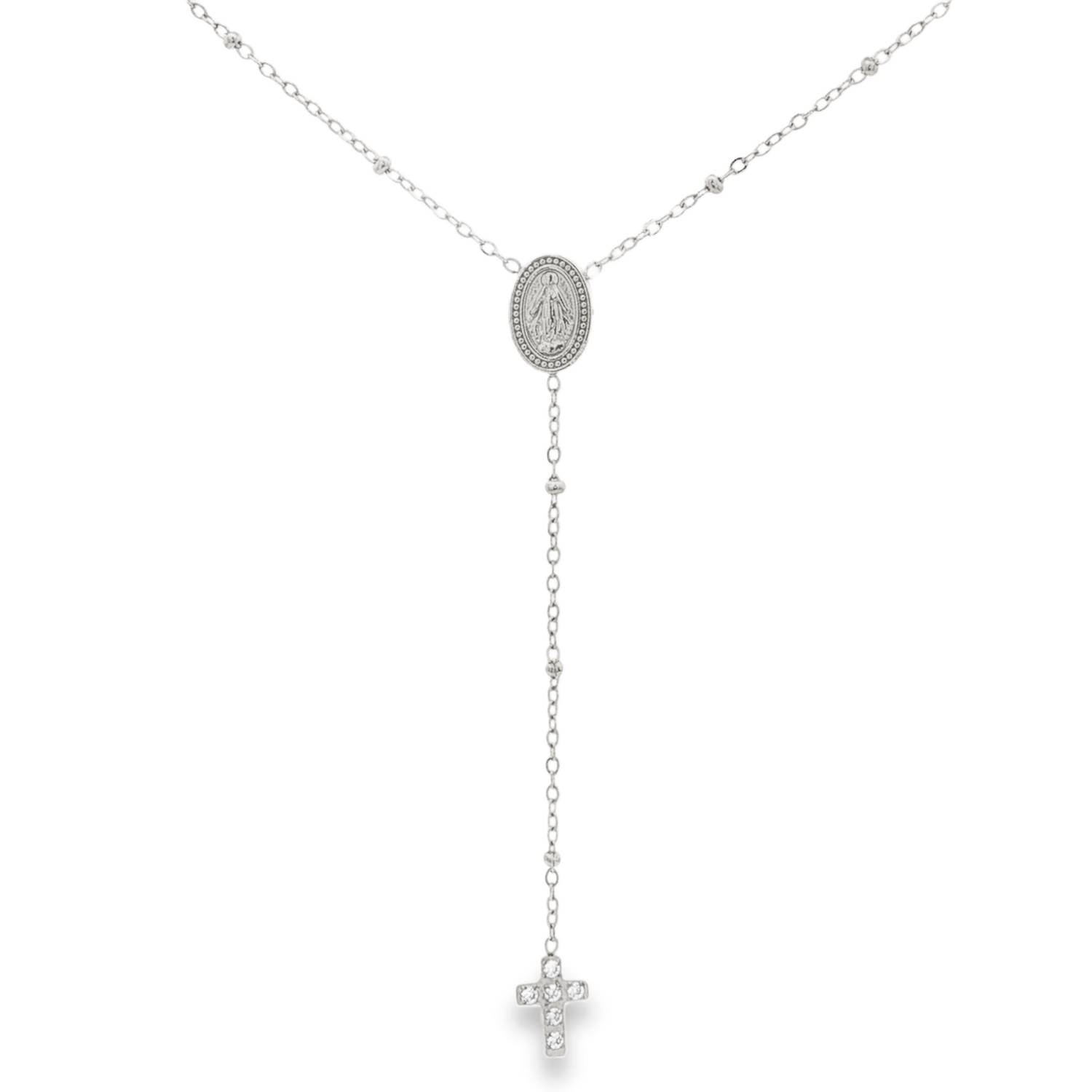 Sublime collier chapelet en acier argenté, conçu avec une chaîne délicate et des motifs religieux empreints de finesse.