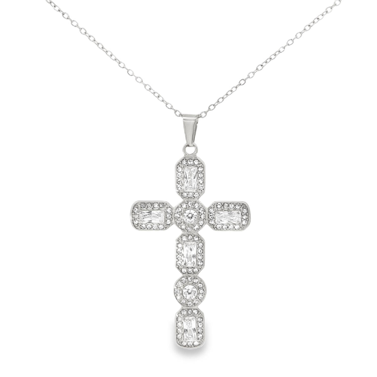 Découvrez ce collier acier argenté, agrémenté d'un pendentif croix éclatant.