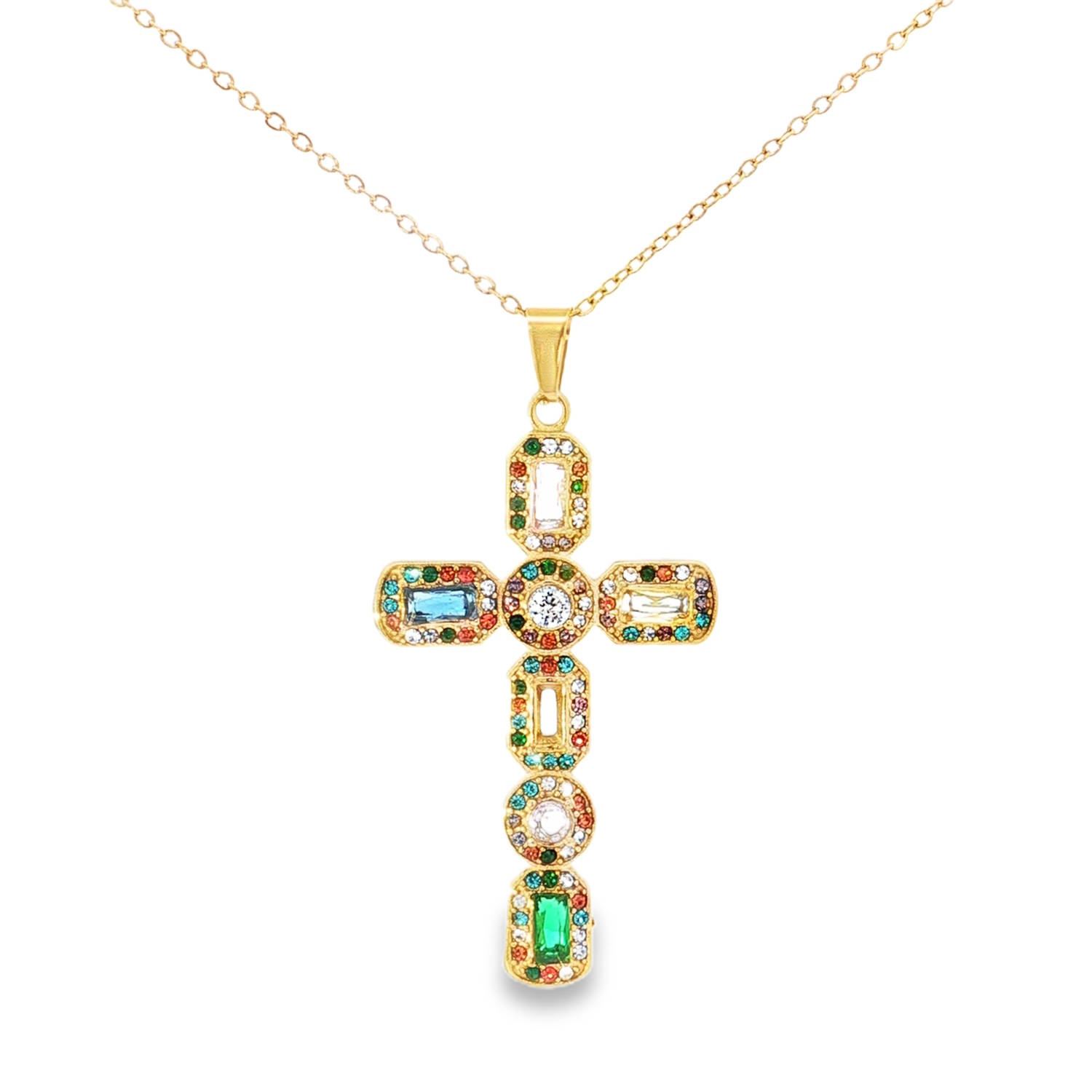 Découvrez ce collier unique en acier doré, orné d'un pendentif croix éclatant.