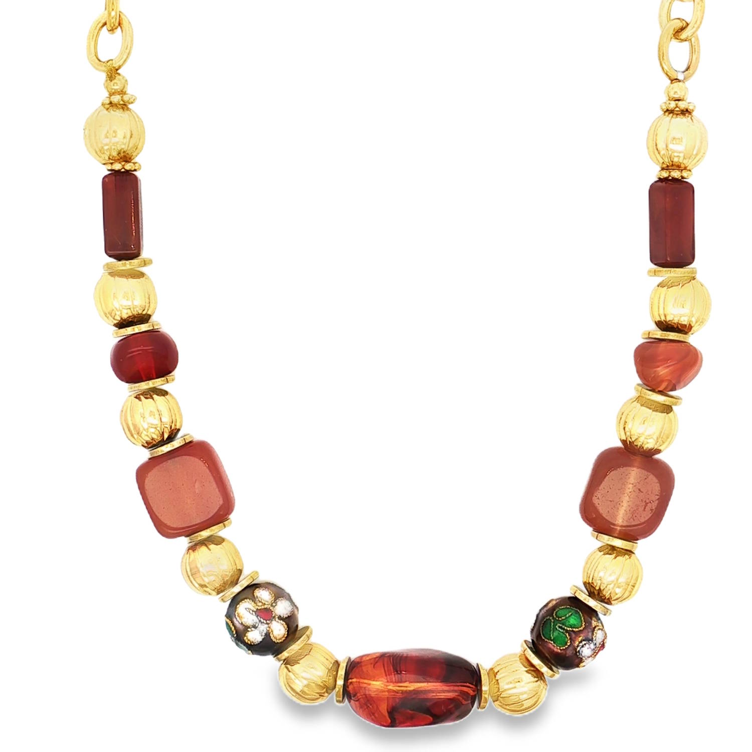 Ce collier de perles en acier doré présente un design riche et complexe.