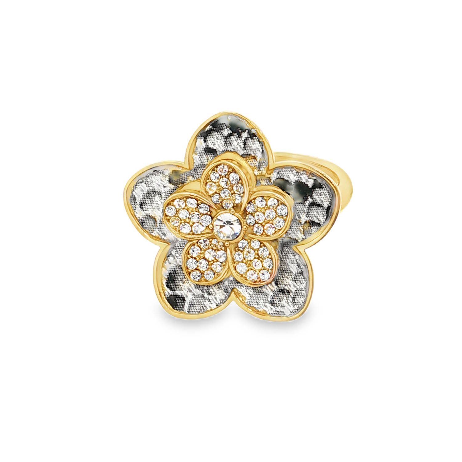 Arborez une élégance audacieuse avec cette bague cocktail florale.<br/>Façonnée en acier doré, elle se distingue par son motif de pétales texturés.<br/>Un dôme de strass ronds taille brillant illumine le cœur de cette pièce unique, capturant la lumière sous tous les angles.<br/>Une alliance parfaite de sophistication et d'originalité.<br/>Taille ajustable. Strass  Adolescent Adulte Femme Fille Fleurs Indémodable Nature