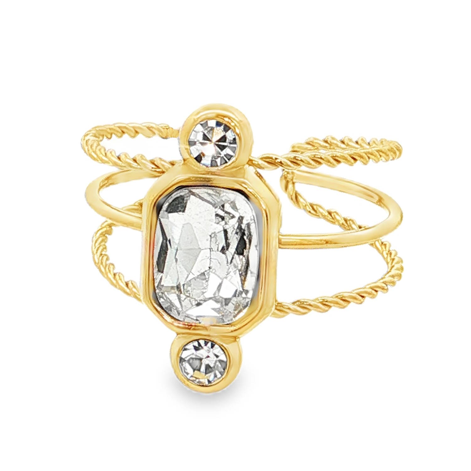 Description Cette bague multistone en acier doré est ornée d'un cristal de taille émeraude à la coupe brillant qui attire le regard. La monture dorée met en valeur la clarté et l'éclat de la pierre centrale. Une pièce élégante qui apportera une touche de raffinement à votre style. Taille ajustable. Largeur 17 mm Matière(s) Acier , Verre . L'acier utilisé dans la bijouterie existe sous plusieurs qualités. Nous utilisons principalement la qualité 316L, qualité qui est utilisée en chirurgie. Cet acier est donc inoxydable et reste très résistant. Fermoir Aucun Couleur(s) dominante(s) Doré Public Adolescent , Adulte . Genre Femme , Fille . Saison Indémodable . Cliquez sur une matière, un thème, une couleur ou une collection pour voir tous les articles associés.