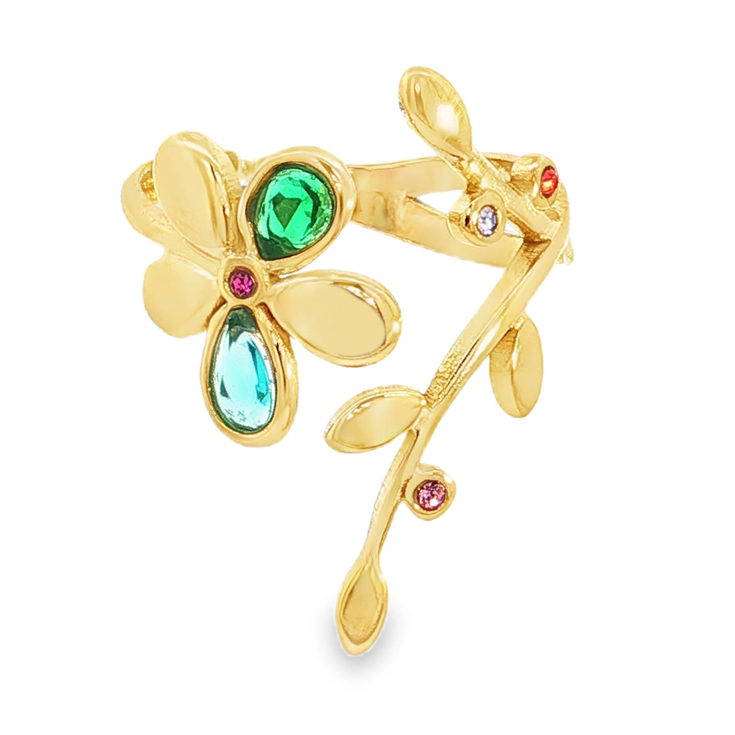 Description Cette bague cocktail en acier doré incarne une élégance ludique. Elle est ornée de cristaux multicolores taillés en cabochon, d'une couleur éclatante. Le design floral et la finition soignée de la monture mettent en valeur la pierre précieuse, faisant de cette bague un bijou unique et raffiné. Taille ajustable. Largeur 23 mm Matière(s) Acier , Verre . L'acier utilisé dans la bijouterie existe sous plusieurs qualités. Nous utilisons principalement la qualité 316L, qualité qui est utilisée en chirurgie. Cet acier est donc inoxydable et reste très résistant. Fermoir Aucun Couleur(s) dominante(s) Doré , Multicolore Public Adolescent , Adulte . Genre Femme , Fille . Saison Indémodable . Thème(s) Fleurs , Nature . Cliquez sur une matière, un thème, une couleur ou une collection pour voir tous les articles associés.