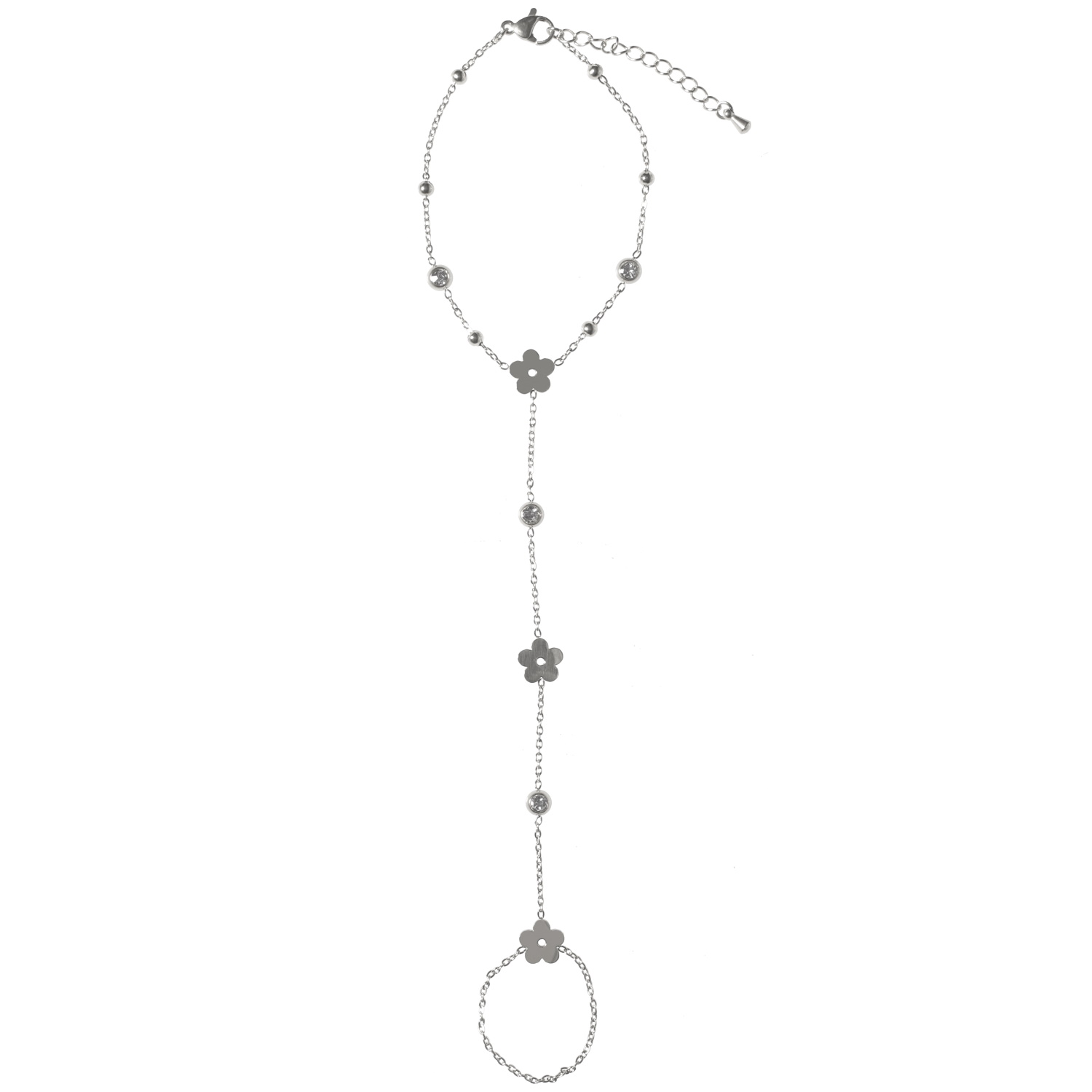 Description Bracelet composé d'une chaîne en acier argenté avec des fleurs et des cristaux sertis clos et d'une bague chaîne. Fermoir mousqueton avec 3 cm de rallonge. Cliquez sur une matière, un thème, une couleur ou une collection pour voir tous les articles associés.