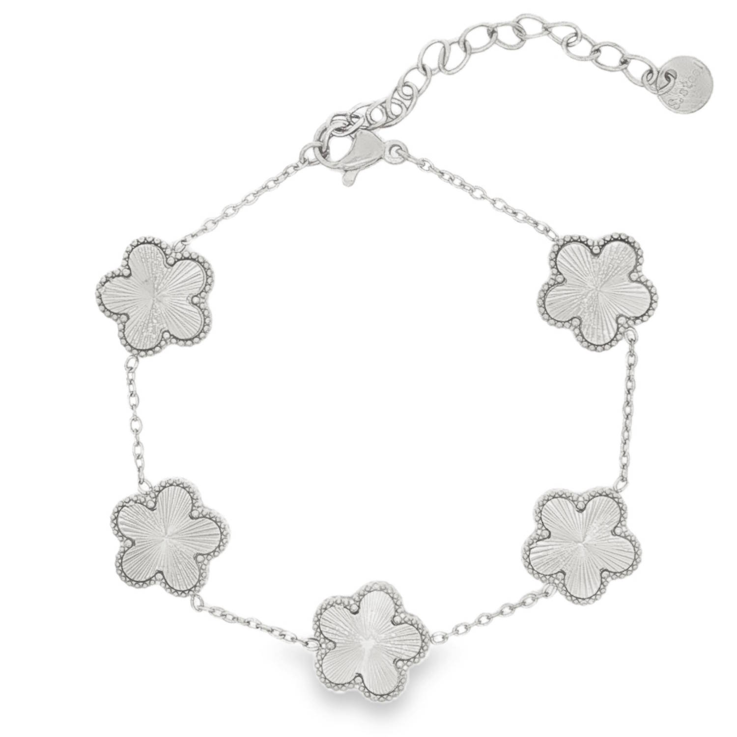 Sublime bracelet chaîne en acier argenté, mettant en valeur cinq motifs floraux délicats.