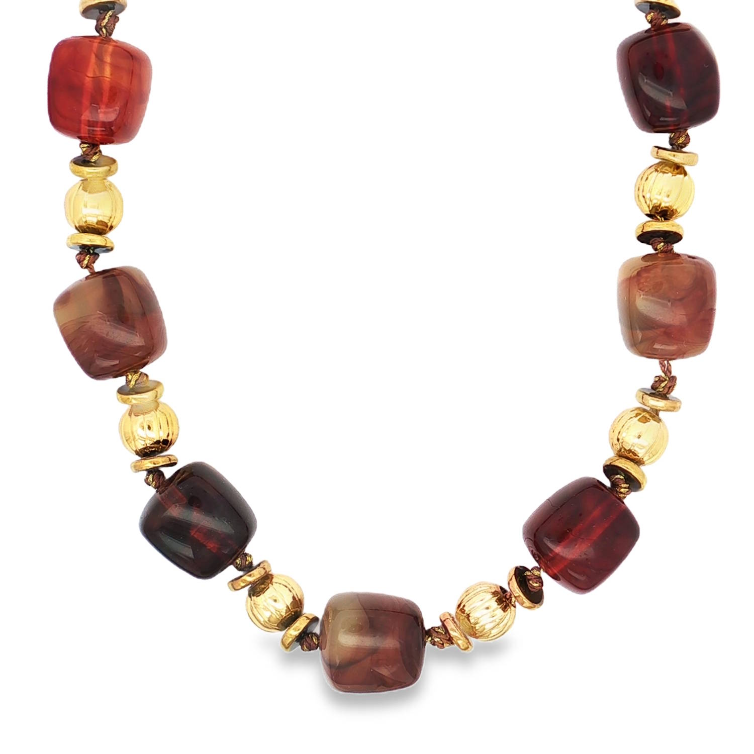 Découvrez ce collier de perles unique, orné de magnifiques perles marron orange taillées en cabochon carré.