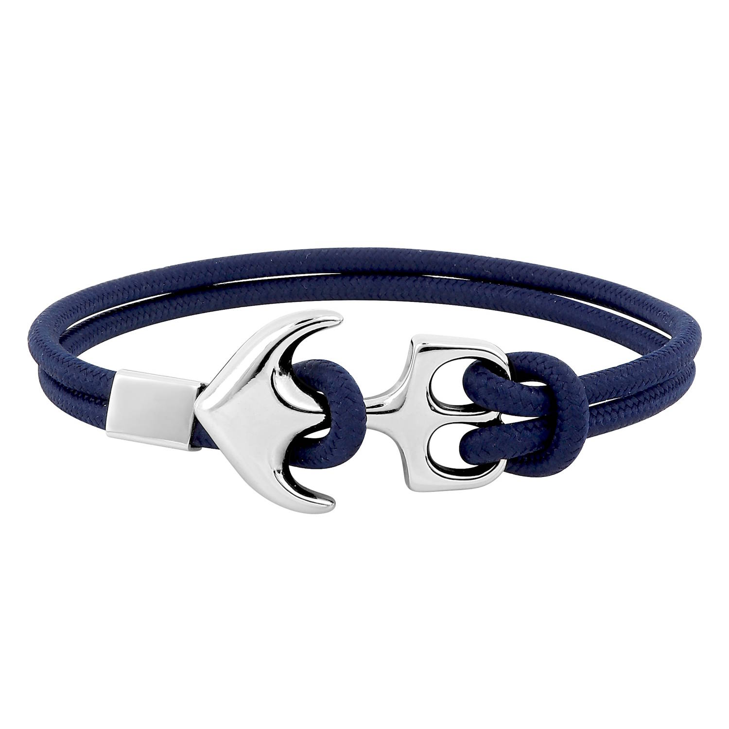 Ce bracelet jonc arbore une esthétique marine avec une cordelette résistante et une ancre stylisée.