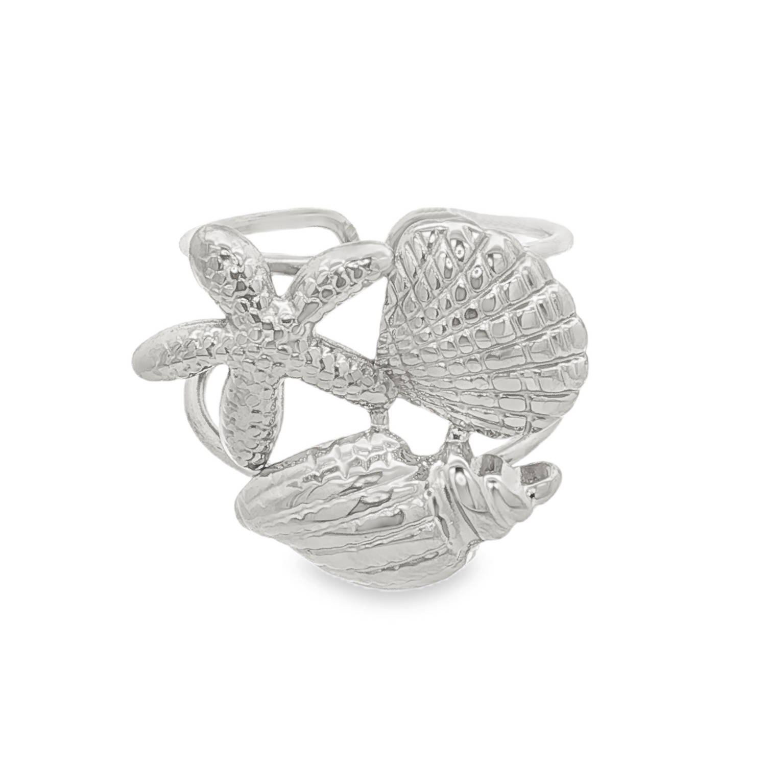 Description Arborez un style marin avec cette bague cocktail en acier argenté. Confectionnée avec une minutie particulière, cette bague met en scène une succession de motifs de la mer tels que l'étoile de mer et des coquillage, créant un bijou à la fois moderne et intemporel. Taille ajustable. Largeur 20 mm Matière(s) Acier . L'acier utilisé dans la bijouterie existe sous plusieurs qualités. Nous utilisons principalement la qualité 316L, qualité qui est utilisée en chirurgie. Cet acier est donc inoxydable et reste très résistant. Fermoir Aucun Couleur(s) dominante(s) Argenté Public Adolescent , Adulte . Genre Femme , Fille . Saison Eté , Printemps . Thème(s) Animaux , Nature . Collection Seaside Cliquez sur une matière, un thème, une couleur ou une collection pour voir tous les articles associés.