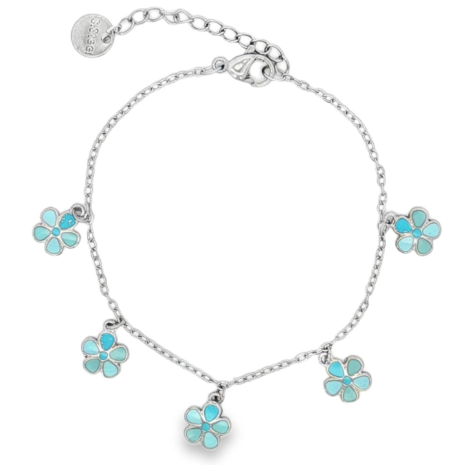 Description Sublime bracelet à charms en acier argenté. Sa chaîne délicate est ornée de multiples breloques en forme de fleur émaillée de couleurs bleues. Chaque élément est agencé avec une symétrie parfaite, offrant un mouvement fluide et gracieux. Une pièce d'exception idéale pour sublimer le poignet avec une sophistication discrète et luxueuse. Fermoir mousqueton avec 3 cm de rallonge.