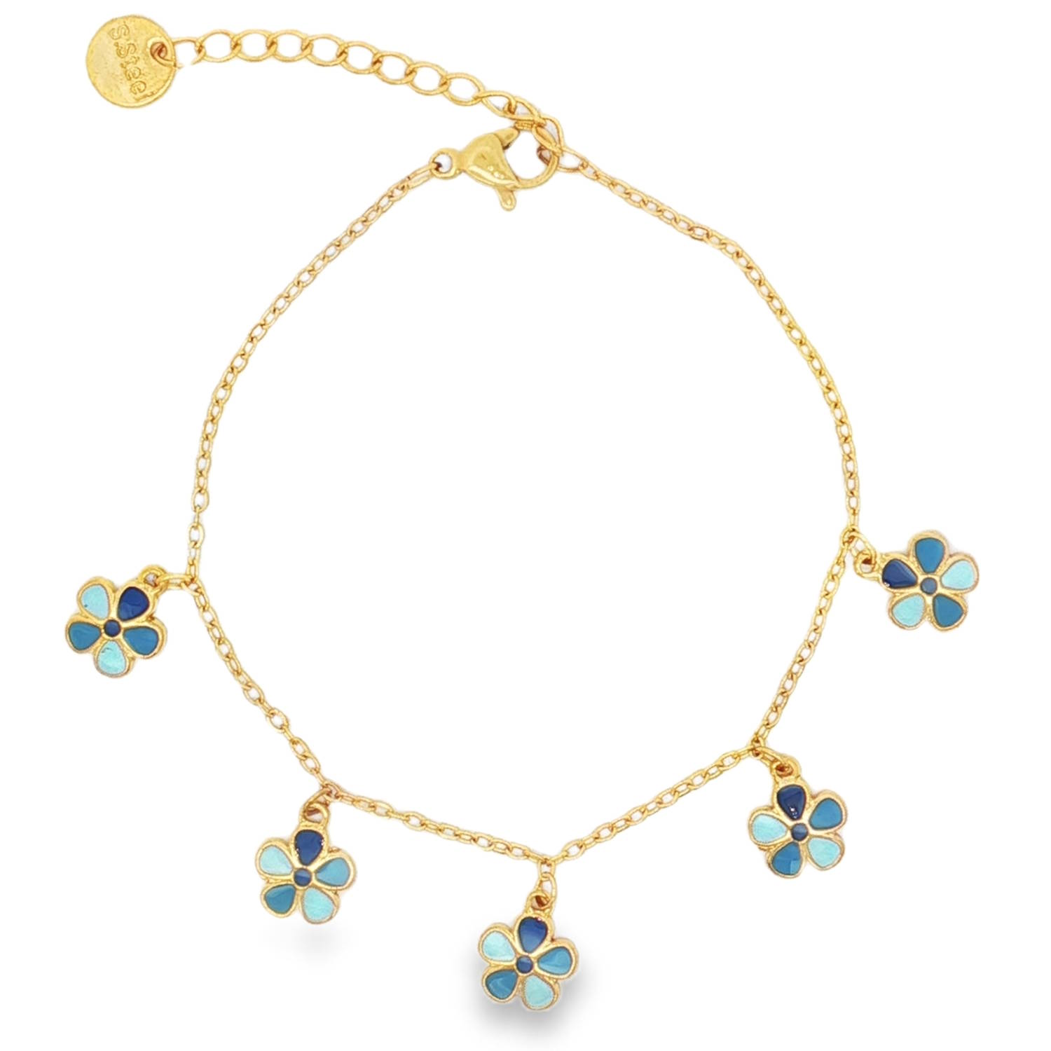 Description Sublime bracelet à charms en acier doré. Sa chaîne délicate est ornée de multiples breloques en forme de fleur émaillée de couleurs bleues. Chaque élément est agencé avec une symétrie parfaite, offrant un mouvement fluide et gracieux. Une pièce d'exception idéale pour sublimer le poignet avec une sophistication discrète et luxueuse. Fermoir mousqueton avec 3 cm de rallonge.