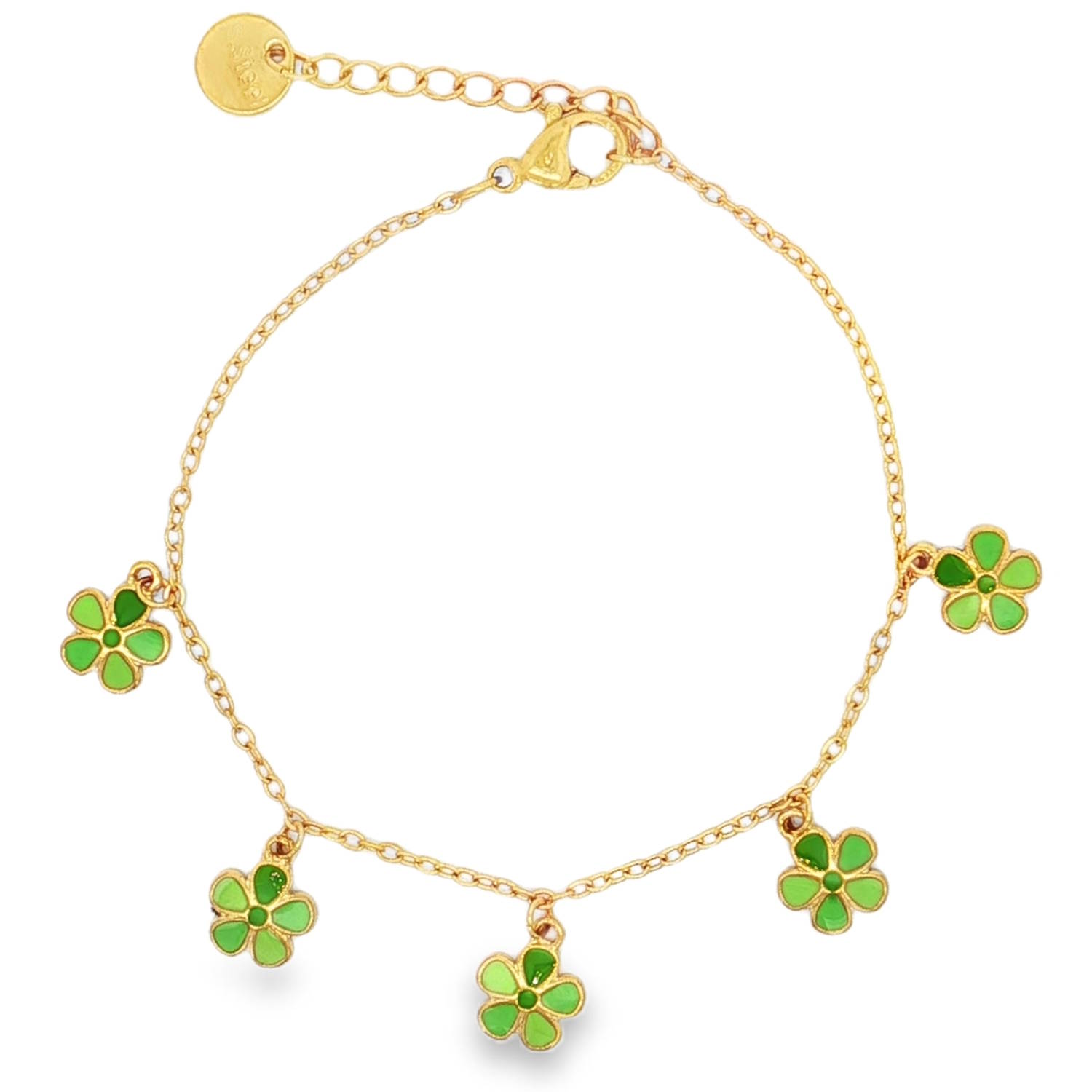 Description Sublime bracelet à charms en acier doré. Sa chaîne délicate est ornée de multiples breloques en forme de fleur émaillée de couleurs vertes. Chaque élément est agencé avec une symétrie parfaite, offrant un mouvement fluide et gracieux. Une pièce d'exception idéale pour sublimer le poignet avec une sophistication discrète et luxueuse. Fermoir mousqueton avec 3 cm de rallonge.
