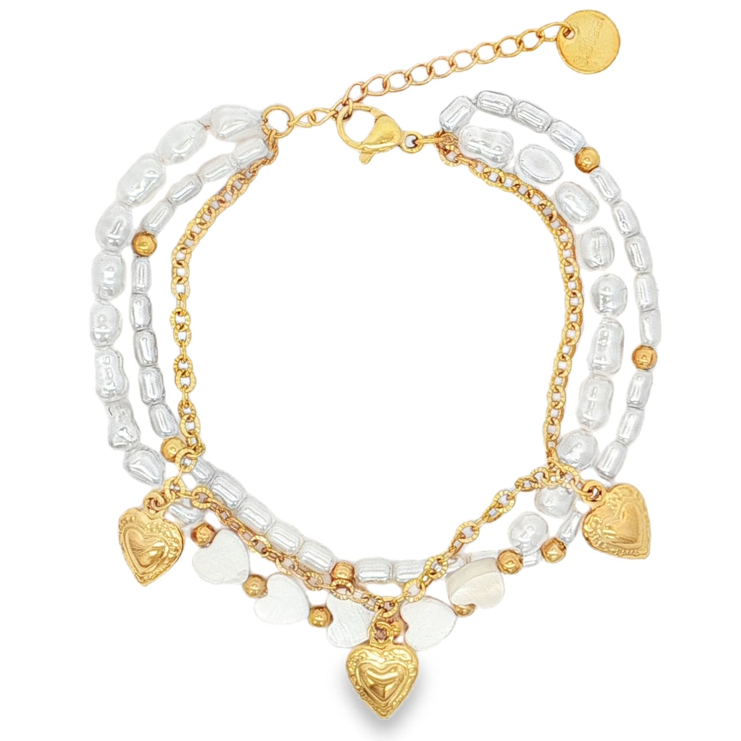 Il présente des perles baroques aux reflets nacrées et des perles nacrées en forme de coeur alternant avec des éléments en acier.