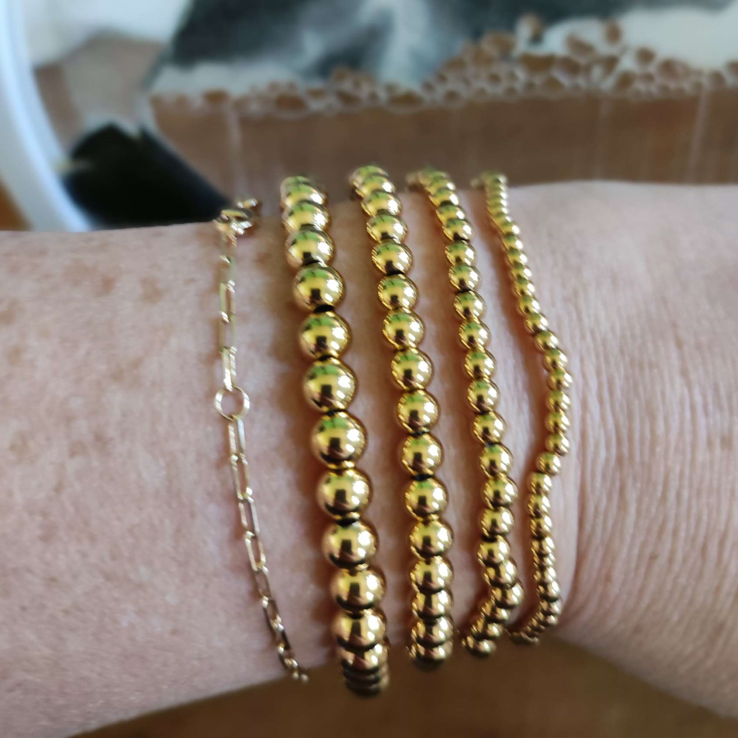 Description Ce somptueux lot de 4 bracelets élastiques en acier doré se compose de perles sphériques harmonieusement agencées pour un éclat continu. Le montage assure une symétrie parfaite et un tombé fluide sur le poignet. Un bijou intemporel idéal pour une élégance quotidienne ou une occasion spéciale. Longueur 16 cm [Guide des tailles] Largeur 17 mm Matière(s) Acier . L'acier utilisé dans la bijouterie existe sous plusieurs qualités. Nous utilisons principalement la qualité 316L, qualité qui est utilisée en chirurgie. Cet acier est donc inoxydable et reste très résistant. Fermoir Aucun Couleur(s) dominante(s) Doré Public Adolescent , Adulte . Genre Femme , Fille . Saison Indémodable . Cliquez sur une matière, un thème, une couleur ou une collection pour voir tous les articles associés.