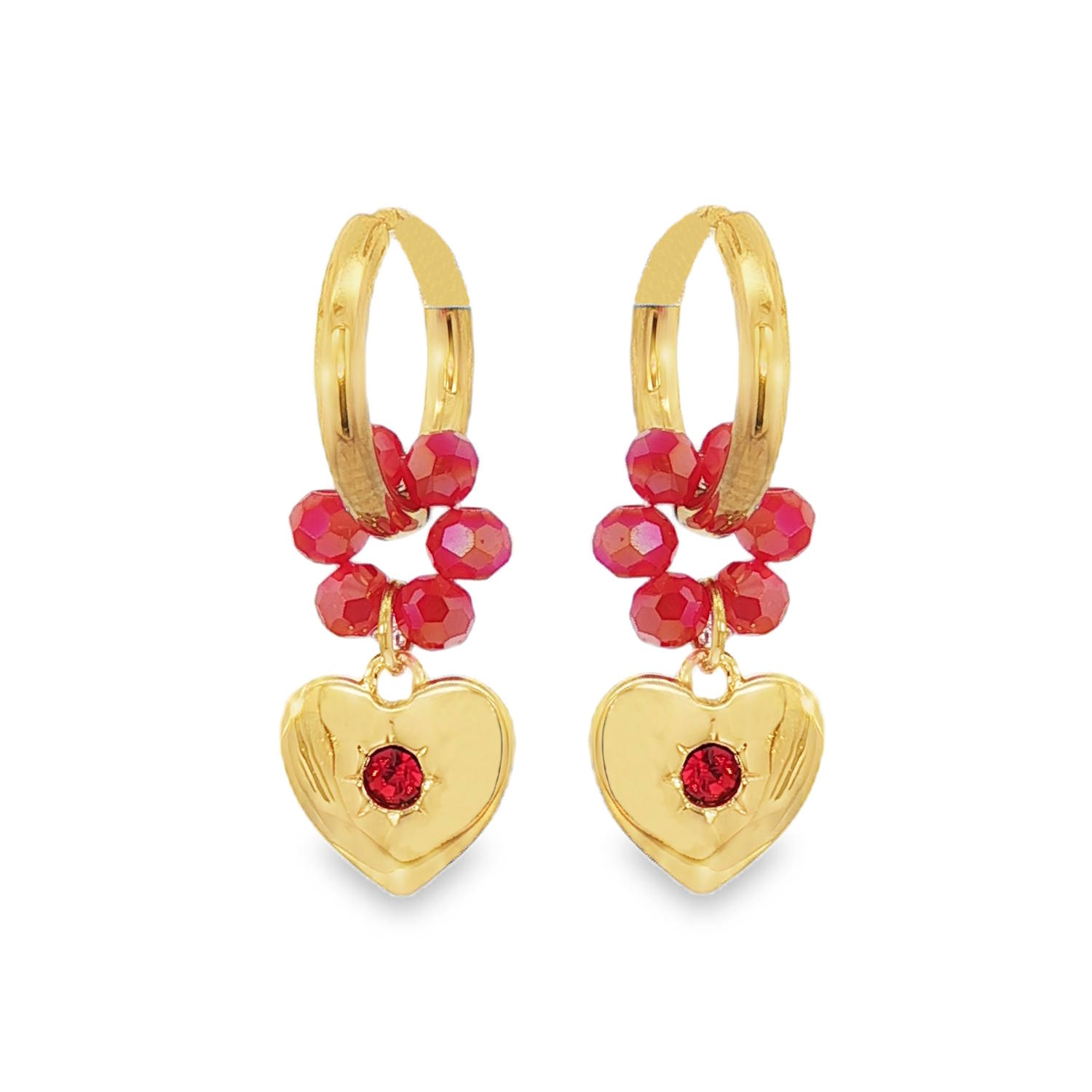 Ces élégantes boucles d'oreilles créoles en acier doré arborent un design de cœur suspendu.<br/>Chaque boucle est ornée d'une série de perles rondes d'un rouge éclatant, soigneusement sélectionnées pour leur polissage lisse et leur couleur homogène.<br/>Chaque coeur est serti d'un cristal rouge étincelant.<br/>Une composition artisanale sophistiquée, idéale pour ajouter une touche de couleur naturelle et d'élégance intemporelle à votre allure. Coeur Créoles Perle Strass  Adolescent Adulte Amour Eté Femme Fille Printemps
