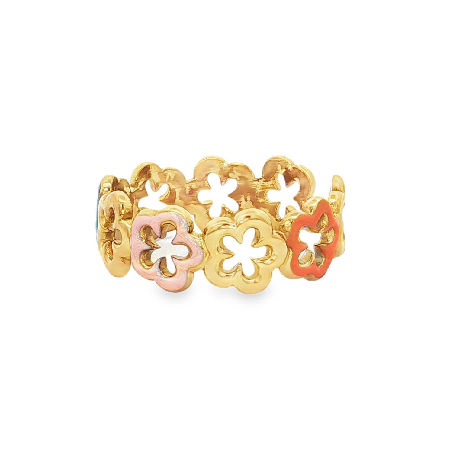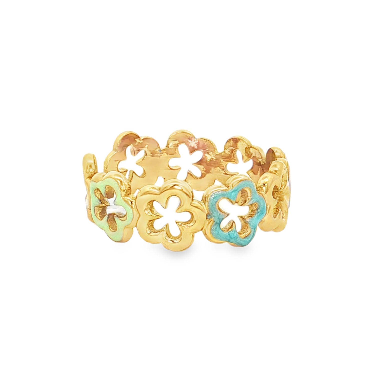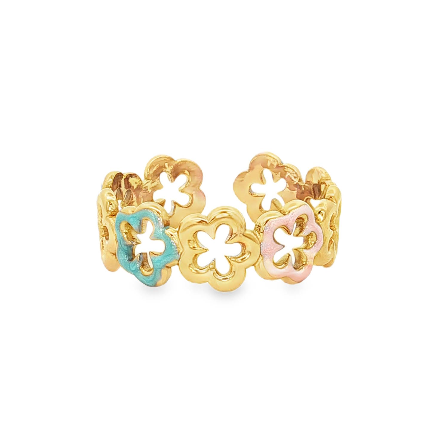 Cette bague en acier inoxydable doré est une pièce à la fois poétique et printanière, idéale pour apporter une touche de fraîcheur et de couleur à vos mains.